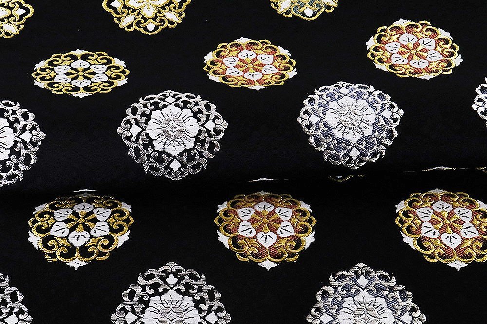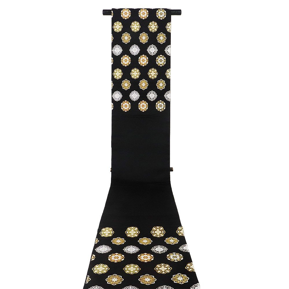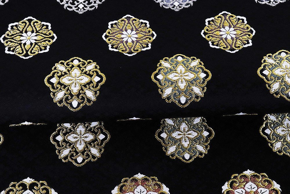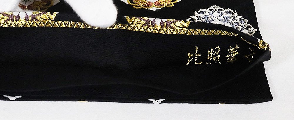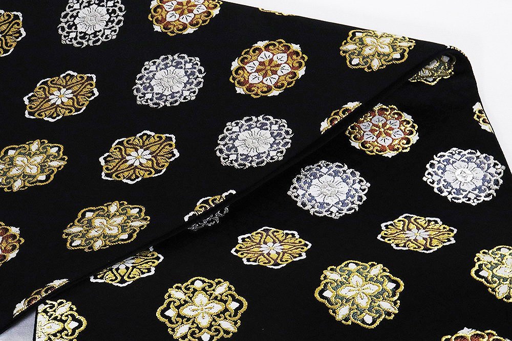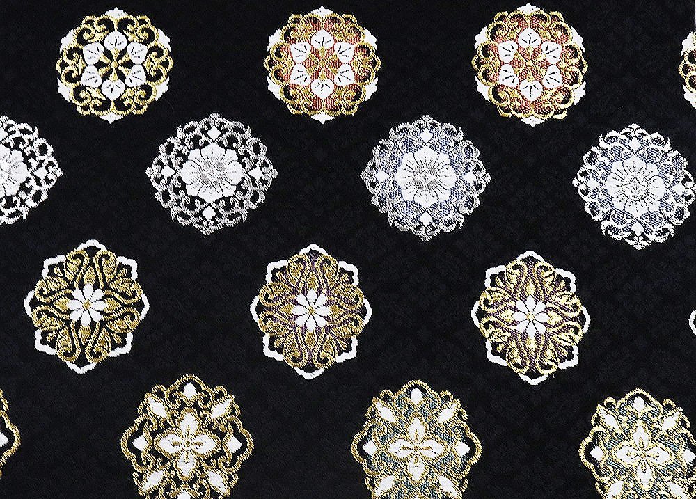 | 西陣織袋帯 比照華文 黒・花菱地模様地 金糸・銀糸・縫い取り・華文 新品 仕立て上がり |