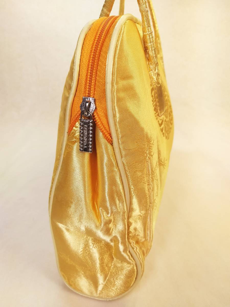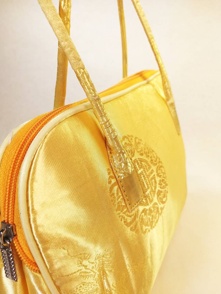 写真をご覧下さい。この手工芸100%純シルク製ショルダーバッグの外側生地は、最高級、最高価格の100%純シルク製で、内側生地は、最極上質のビロード製で、たいへん綺麗な生地が施されております。バッグ内側の中央には、純麻、綿製の敷層があります。製作は、全てが手工芸によるものです!