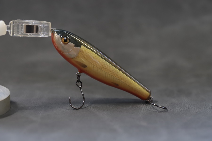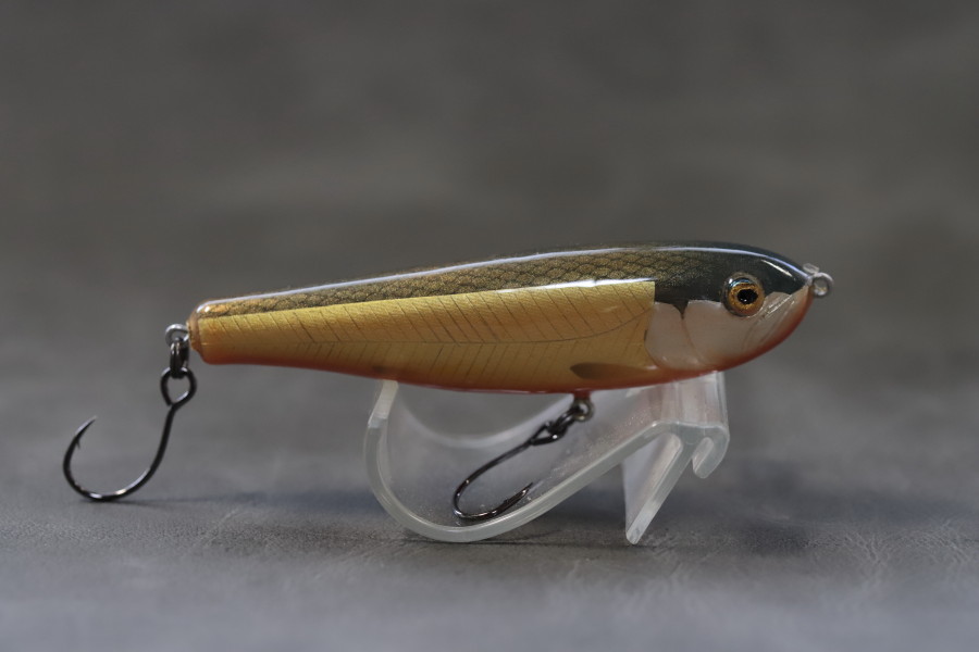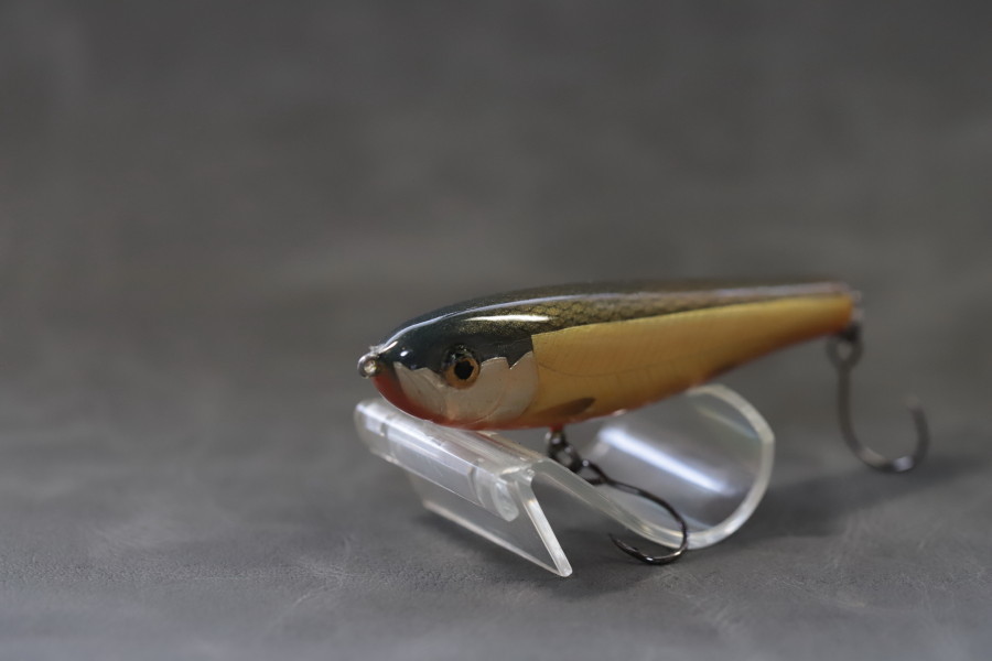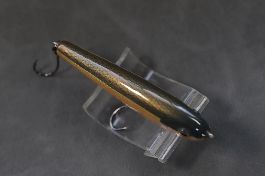 自作オリジナルのハンドメイドルアーです、以前同タイプ銀白系のモノを製作してますがBassとの相性も良く楽しませて貰いました。今回それと同タイプで黑金赤のカラーで製作しました。