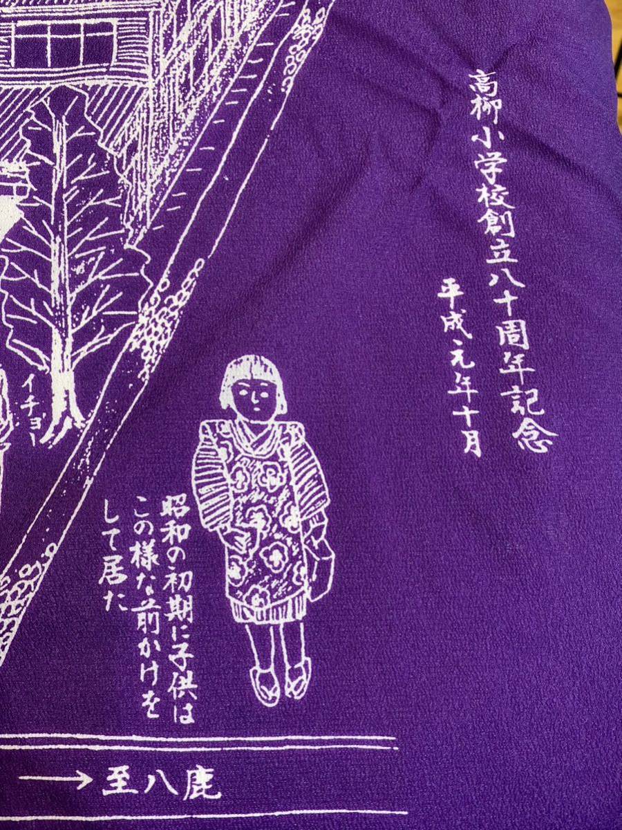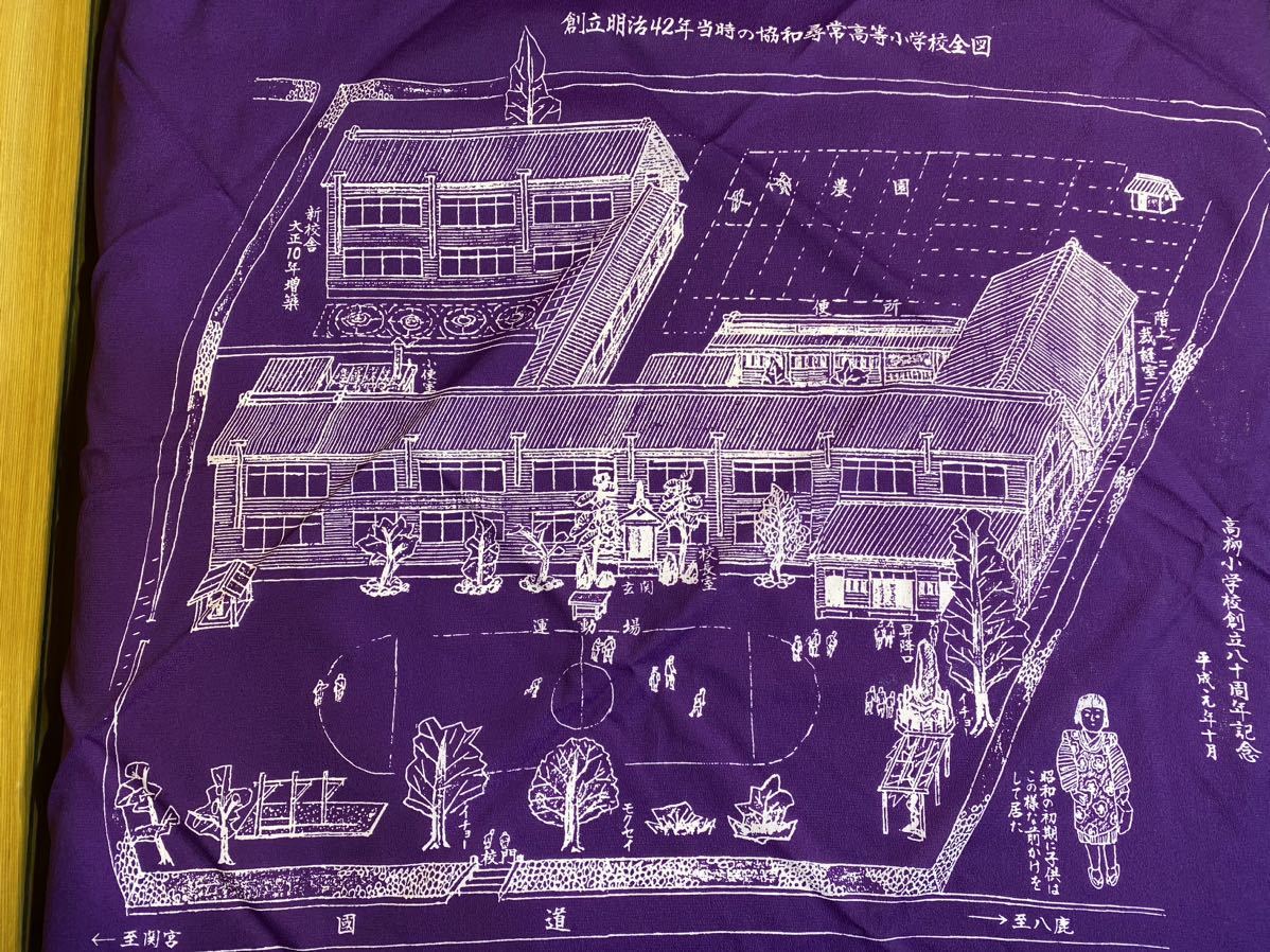 美品! 高柳小学校創立八十周年記念 兵庫 養父市 風呂敷 化繊 72×72cm 協和尋常高等小学校全図 紫