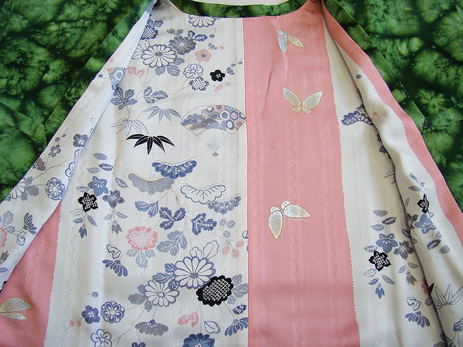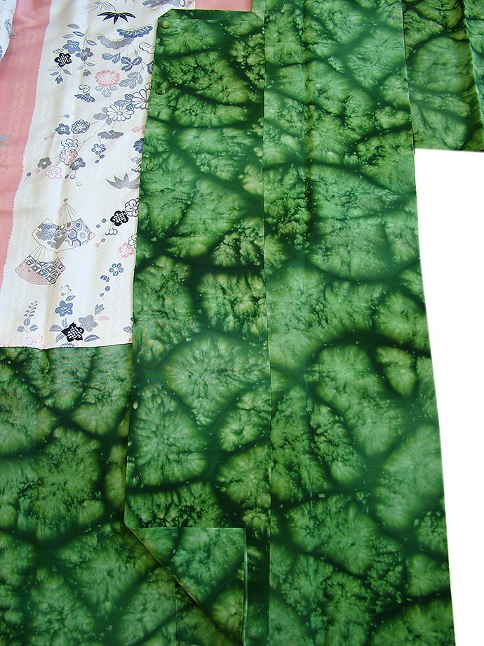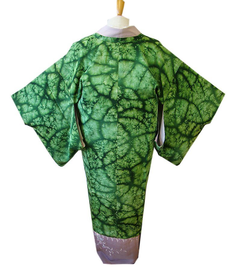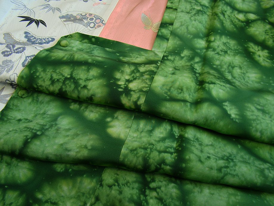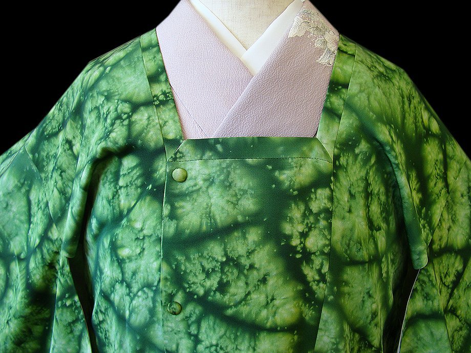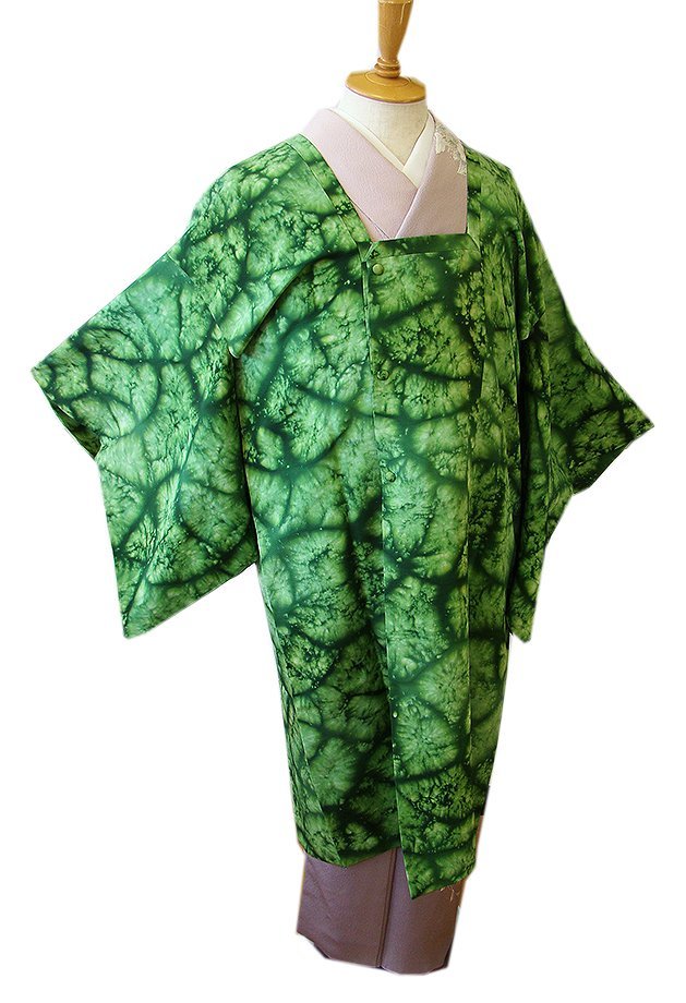 商品説明 | とてもしなやかな大変さらりと滑らかな手触りの柔らかで着心地良い一越地の道行コート。 渋いボトルグリーン色地に苔色ぼかしの葉っぱ?柄の染柄。 手縫い仕立。 お洒落な肩裏も正絹。 |