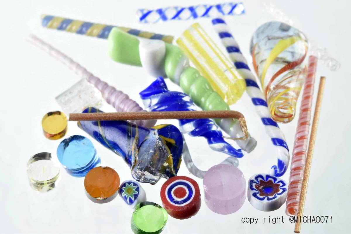 Glass object material exclusively for advanced kaleidoscopes.Multi-colored objects such as ultra-fine, deformed, lace sticks, nuggets, four strokes, dichroic, aventurine gold, etc. You can create a unique kaleidoscope