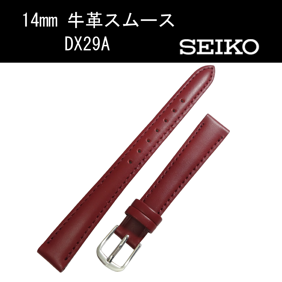 | 新品未使用国内正規品 牛革スムース メーカー:セイコー メーカー品番:DX29A 希望小売価格:3,300円+税 カン幅:14mm 美錠幅:12mm 厚み:2.8mm 長さ:美錠側 65mm(美錠含まず) 剣先側 110mm 色:ワイン 裏材:テグラン 形状:標準タイプ 美錠:アルミ 尾錠は銀色のみとなります。 | ||