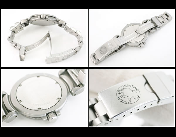 その他商品説明 | 世界的なアウトドアファッションブランドとして知られるハンティングワールドから、シルバーボディにブラックダイヤルがシックな印象の「スポーツアバウト」をご紹介します。当商品はスポーティーな印象のラウンドケースに、個性的なベゼルを組合わせたデザインが大変印象的です。また、ダイヤル上の12時位置にはブランドシンボルである「牙のない仔象が」がデザインされており、オレンジカラーの指針と共にデザインのアクセントにもなっています。当モデルは市場流通の少ない品であり、程度の良い品は大変希少です。この機会に是非ご検討下さい。 状態:本体・ブレスレットに若干の微細な小傷はありますが、いずれも気になるものではありません。ガラスにごく微細な小傷がありますが、肉眼ではわからないレベルです。ランクAにつき自信を持ってお勧めします。 |