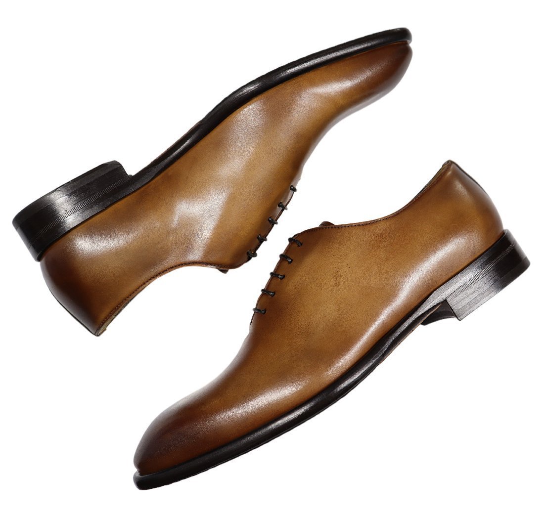 ラウンドトゥ&細身ロングノーズの美しいフォルムに、エレガントなブラウンのアンティークフィニッシュが特徴の5アイレットのホールカットシューズ。