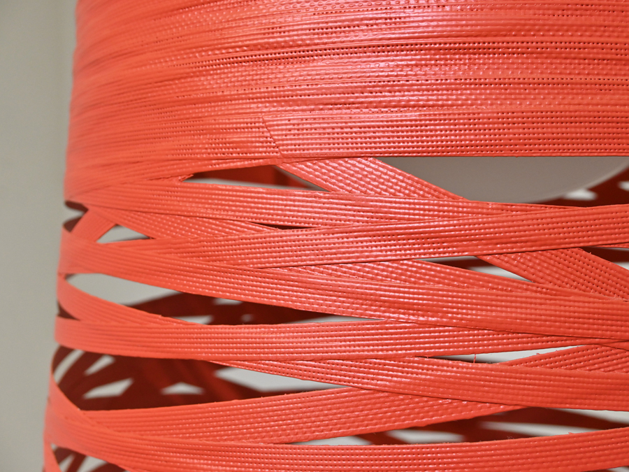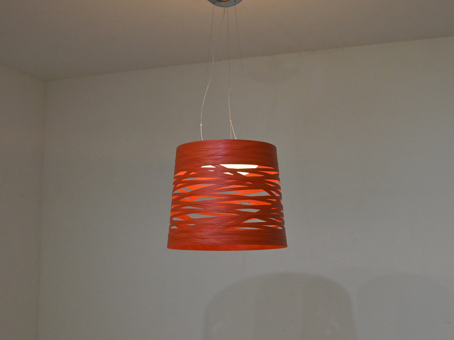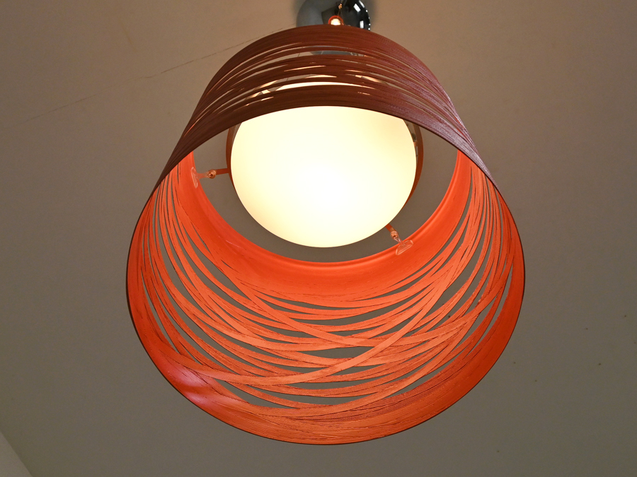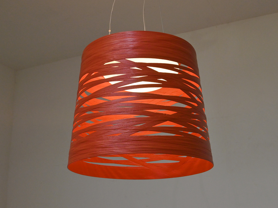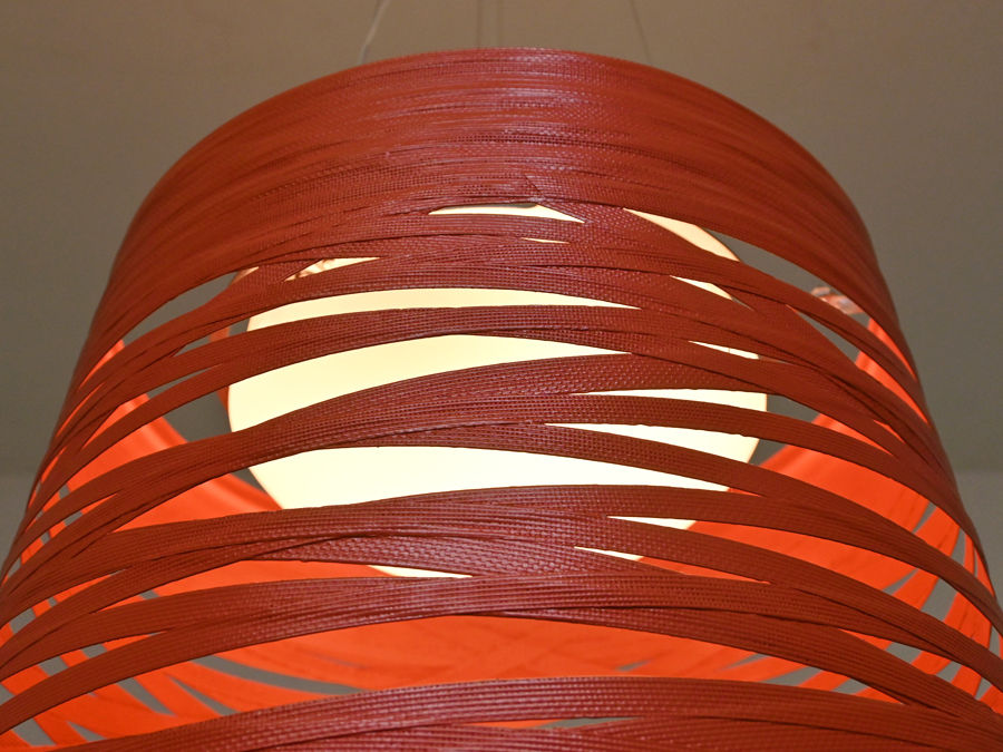 ファイバーグラスで作られた赤いリボンが絡むようなシェードが目を引く独創的なプロダクト。