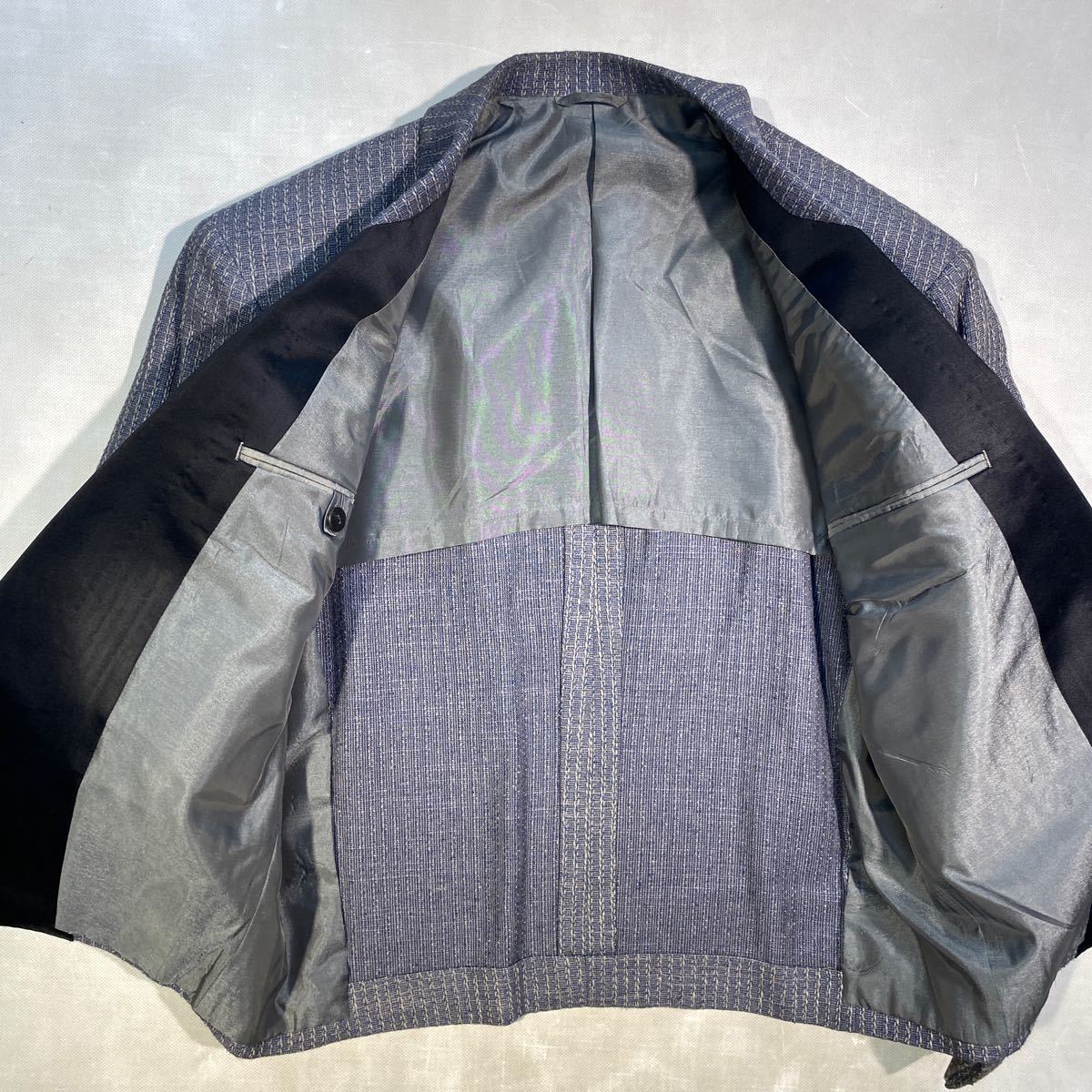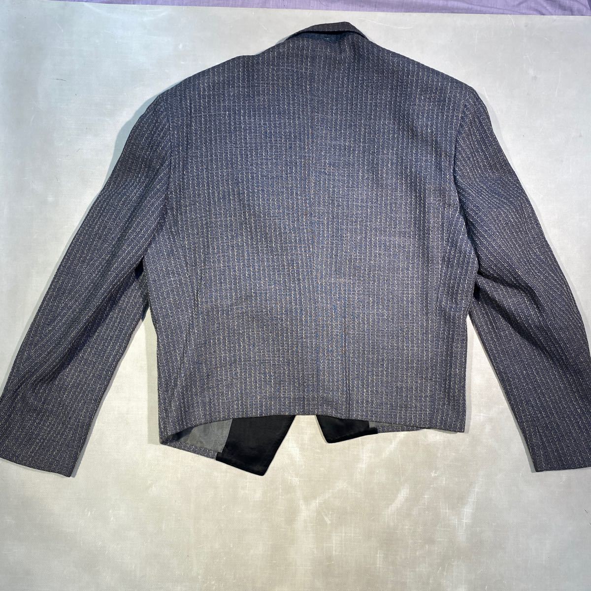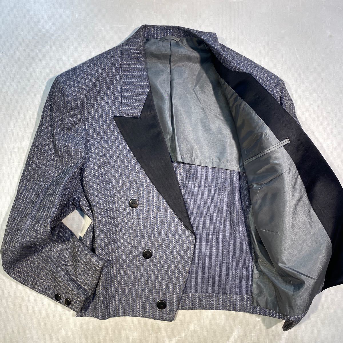 ベイビーブルーと白糸が編み込まれてストライプ状になっているオシャレジャケットです