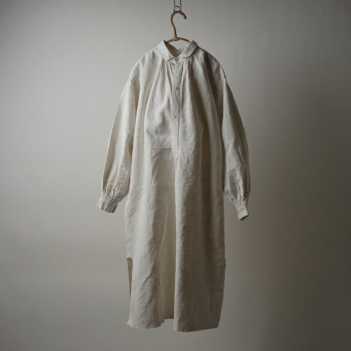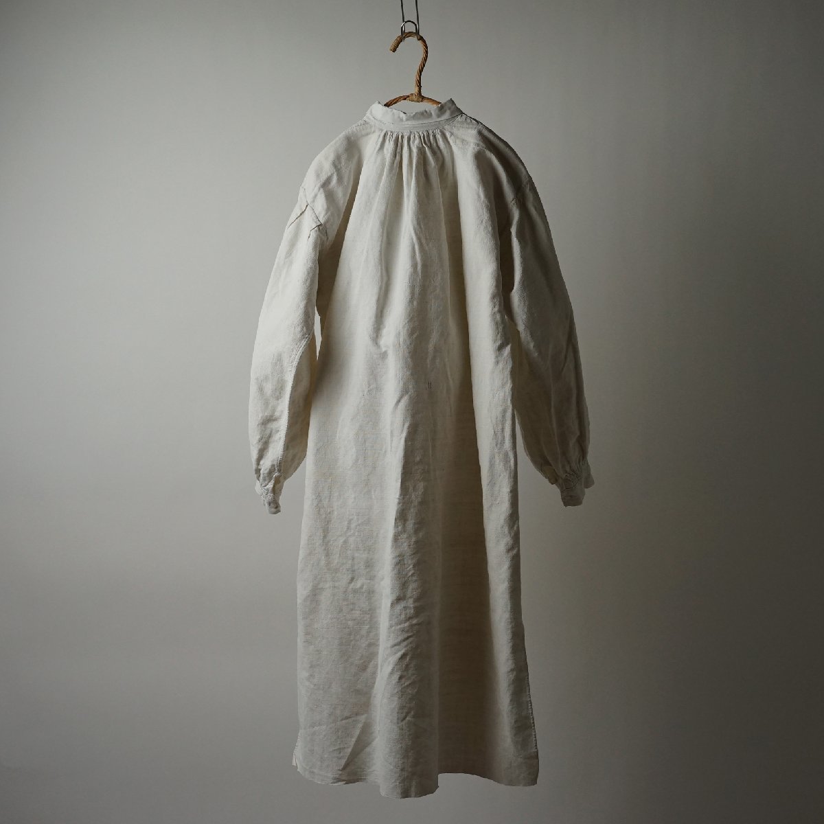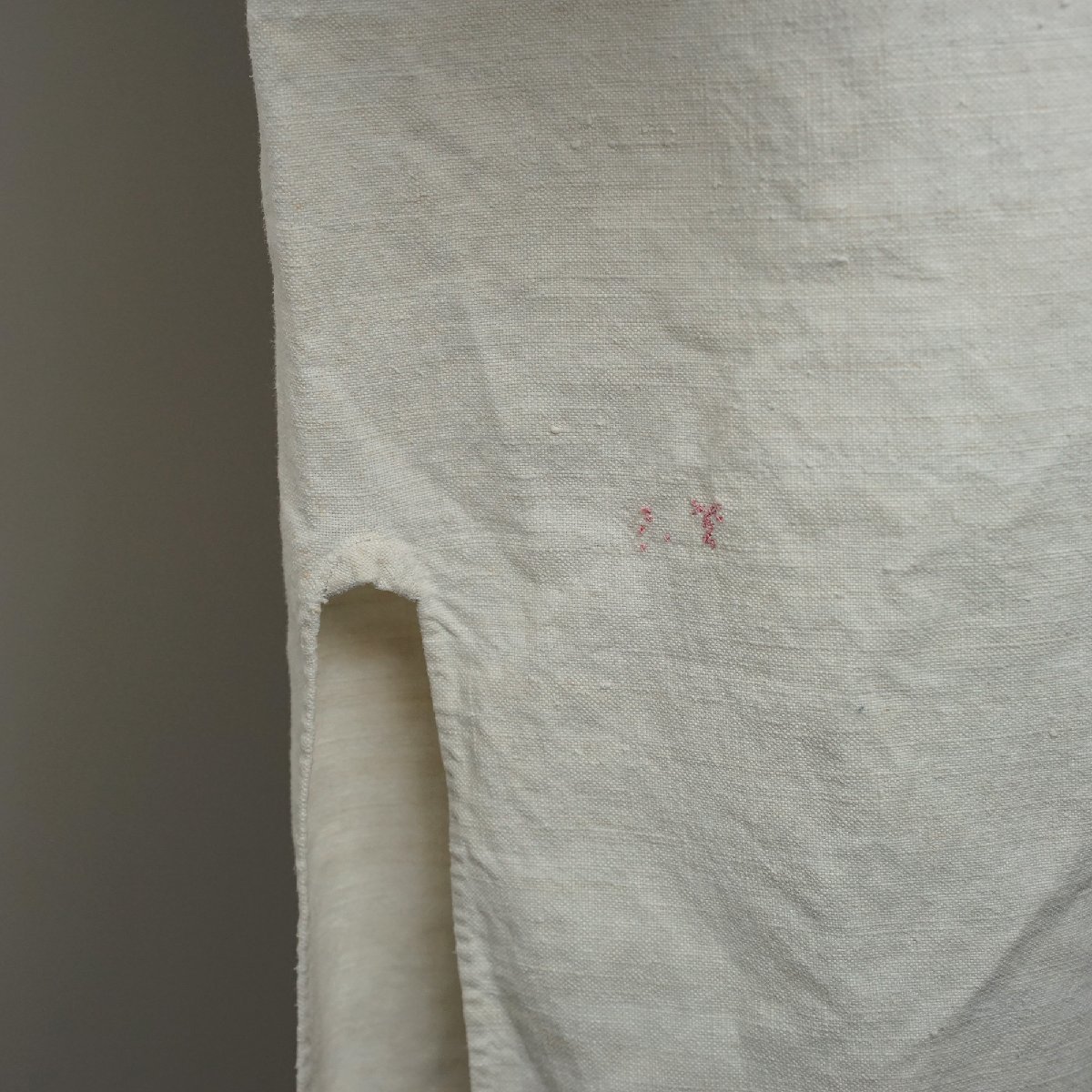 ○素材:しっかりした質感のリネン素材です。襟は柔らかいコットン素材です。袖口と前上部はボタンで閉じるデザインです。右脇スリット横に赤いイニシャルの刺繍があります。両脇裾に25cm程度のマチ付スリットが入っていて、裾淵は裁ち切り処理になっています。フランス購入品です。