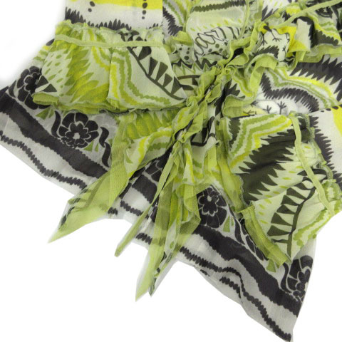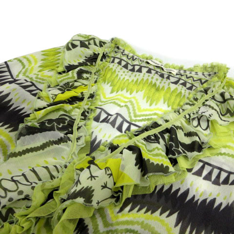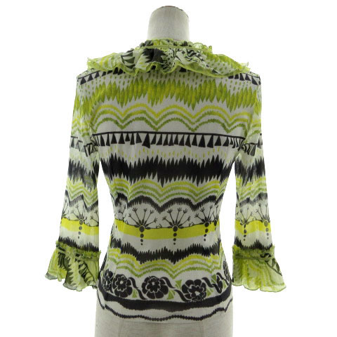 ヒロココシノ HIROKO KOSHINO ボレロ フリル クロップド丈 七分袖 ベルスリーブ シースルー 日本製 総柄 緑 黄色系 ネイビーグレー 白 38