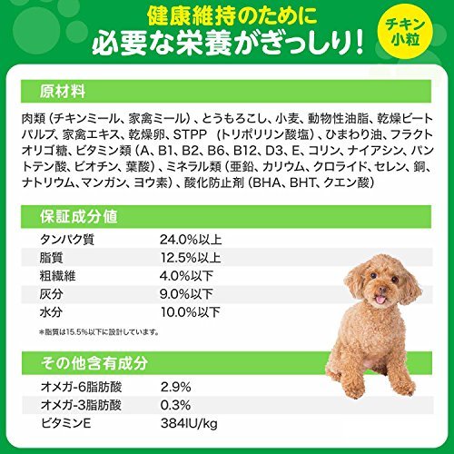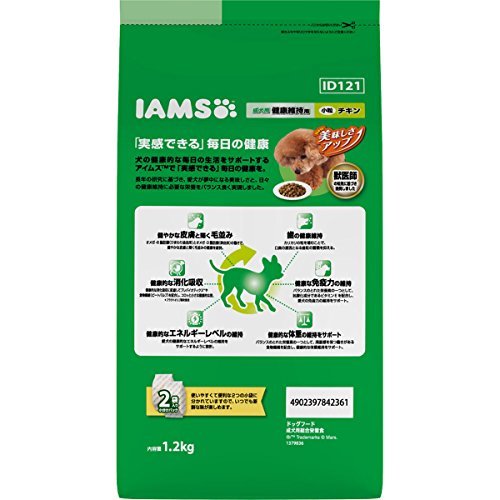 2袋入・ 1.2kg×6 ID121・本体サイズ (幅X奥行X高さ) :18×12×34.3cm・本体重量:1.2kg・原産国:タイ・パッケージ重量: 8.12 kg商品紹介 全ての成犬の健康な生活のために最適な製品設計。ワンちゃんが大好きなチキンを使用。 使用上の注意 直射日光の当たらない、湿気の少ない涼しいところに保管してください。開封後は、開封口を必ず閉じて、なるべく早く使い切ってください。また、虫が入らないように、しっかり密封してください。 原材料・成分 肉類(チキンミール、家禽ミール)、小麦、とうもろこし、大麦、チキンオイル、植物性タンパク、家禽エキス、乾燥ビートパルプ、乾燥酵母、フィッシュオイル、STPP (トリポリリン酸塩)、フラクトオリゴ糖、ビタミン類(A、B1、B2、B6、B12、D3、E、K3、コリン、ナイアシン、パントテン酸、ビオチン、葉酸)、ミネラル類(亜鉛、カリウム、カルシウム、クロライド、セレン、鉄、銅、ナトリウム、マンガン、ヨウ素)、アミノ酸類(メチオニン)、酸化防止剤(BHA、BHT、クエン酸) 使用方法 体重1kg:30g(200ccカップ0.4)、3kg:60g(200ccカップ0.8)、5kg:90g(200ccカップ1.1)、10kg:150g(200ccカップ1.8)、15kg:200g(200ccカップ2.4)、20kg:250g(200ccカップ3.0)、30kg:335g(200ccカップ4.0)、40kg:415g(200ccカップ5.0) 予告なくパッケージ、仕様(原材料、生産国、色、形状、サイズ等)の変更がある場合がございます。予めご了承ください。
