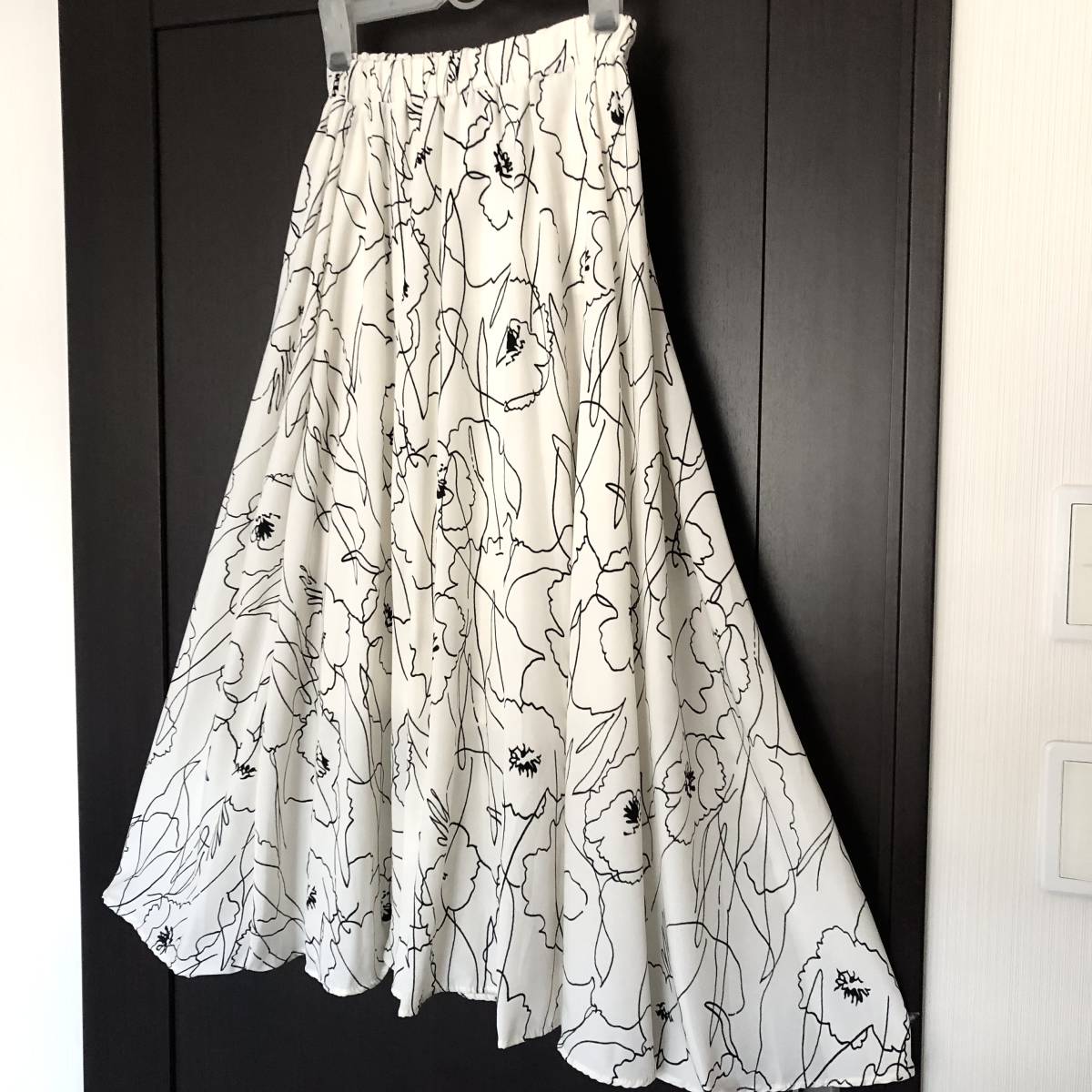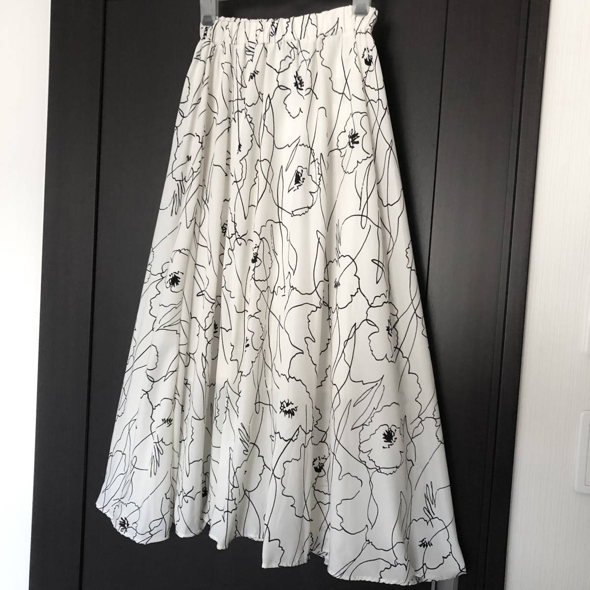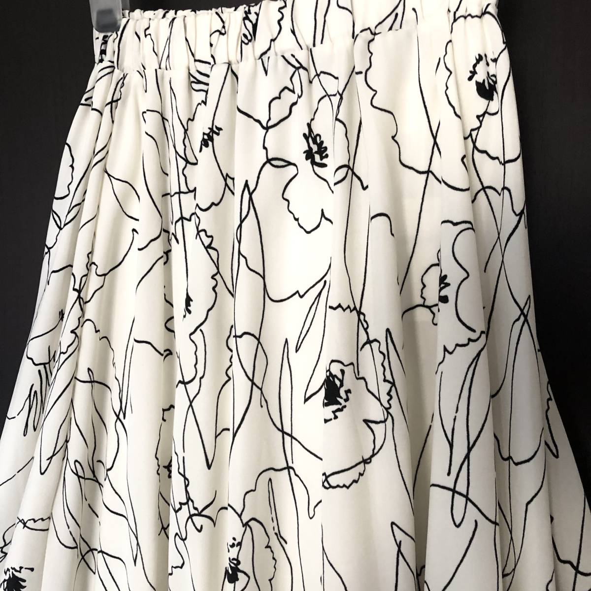 ウエストゴム加工で履き心地最高のロングフレアスカートで、何と言ってもクリームホワイトのキャンバスに黒のサインペンで描いた様な花柄デザインです!!