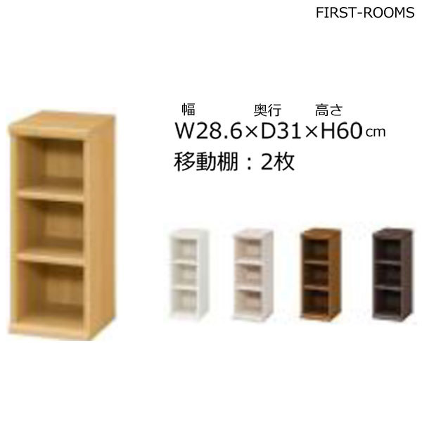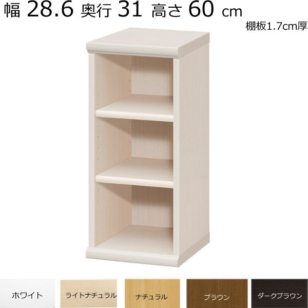 【特徴】本棚・書棚 既製品 定番 規格サイズです。幅28.6、44.2、59.2、70.2、86.5、116.5cm、6タイプ、棚です。高さ60・88・117・135・150・178・200cmの6サイズ、奥行きは31cm、カラーはホワイト・木目調ライトナチュラル・木目調ナチュラル・木目調ブラウン・木目調ダークブラウンの5色。※幅116.5cmは高さ60、88.1kcmのみ※幅70.2cmは高さ178、200cmのみ【本体外寸】幅28.6××奥行き31×高さ60cm(約)(約)【棚板枚数】2枚【幅の内寸】幅25cm※側板(縦の両脇の板)の厚みは1.7cm棚は移動可能で穴から穴までの高さ(ピッチ)は3cm【色・主材】ホワイト・木目調ライトナチュラル・木目調ナチュラル・木目調ブラウン・木目調ダークブラウン・プリント紙化粧繊維板【生産国 】JAPAN※お客様組み立て商品です。(組み立て家具です)【お詫び】送料込ですが、沖縄・離島は別途送料がかかります。【お支払い方法について】申し訳ございませんが、代金引換以外をお選びください。プラスドライバー1本で組み立てられます。