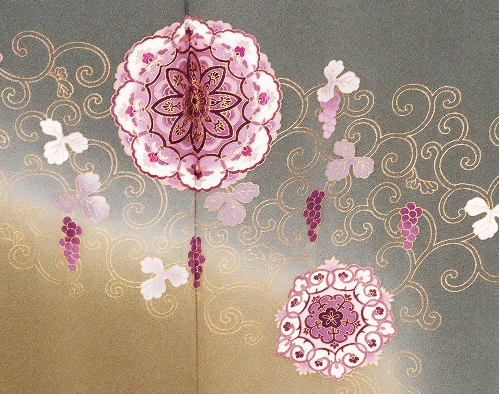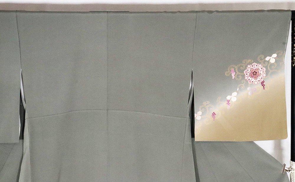 | 色・柄 | 友禅訪問着 袷 丹後縮緬地 グレーかかった緑・くすんだ若草色暈し地 華文・葡萄文 (写真では上手く色が出ない場合があります。ご了承下さい) |
