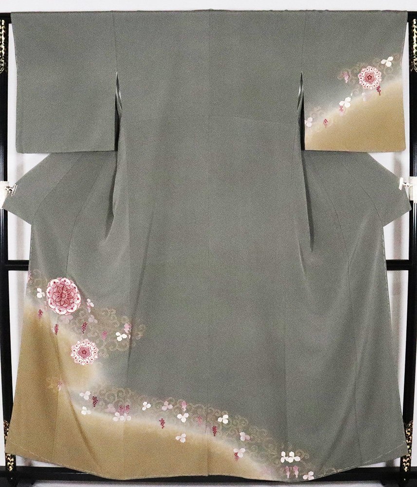| 友禅訪問着 袷 丹後縮緬地 グレーかかった緑・くすんだ若草色暈し地 華文・葡萄文 164 広襟 未使用品 仕付け付き | |
