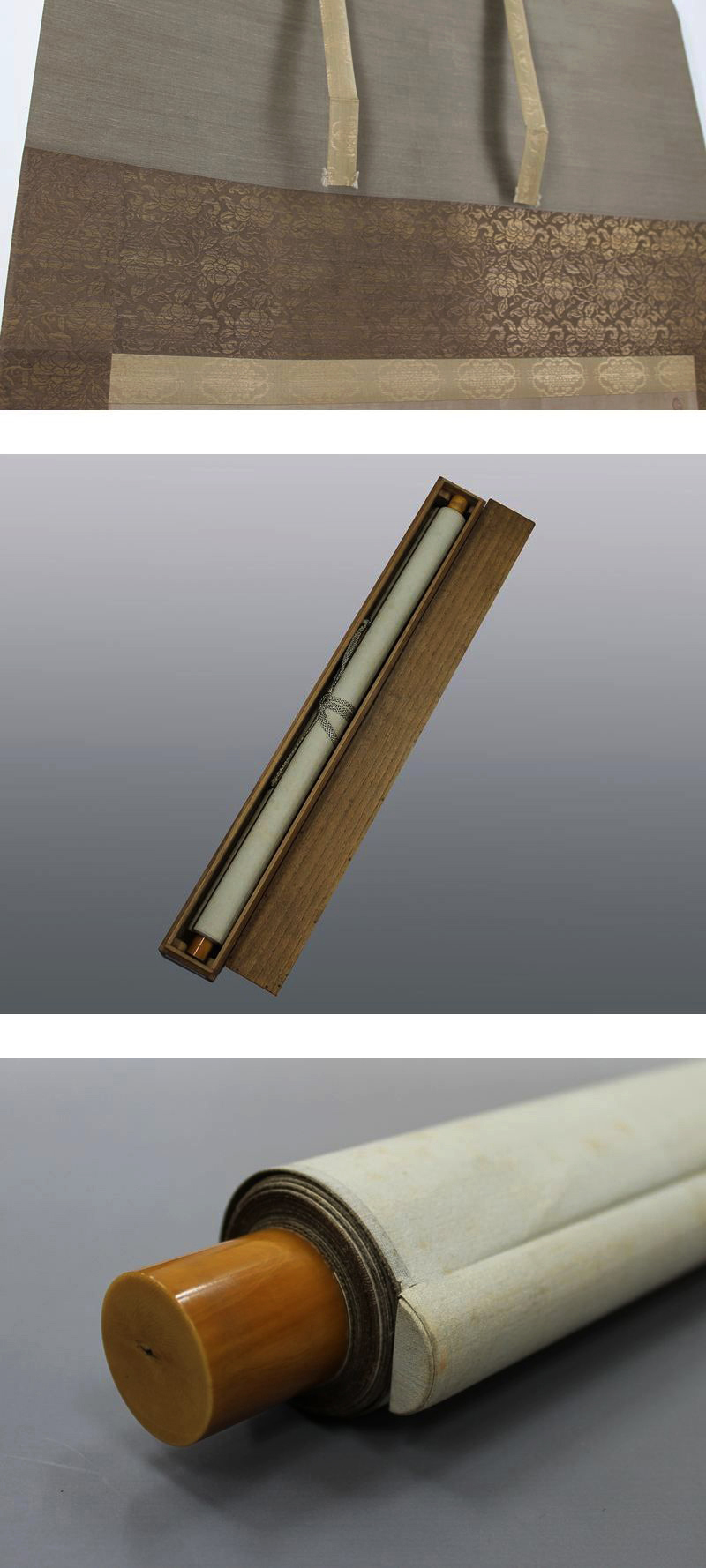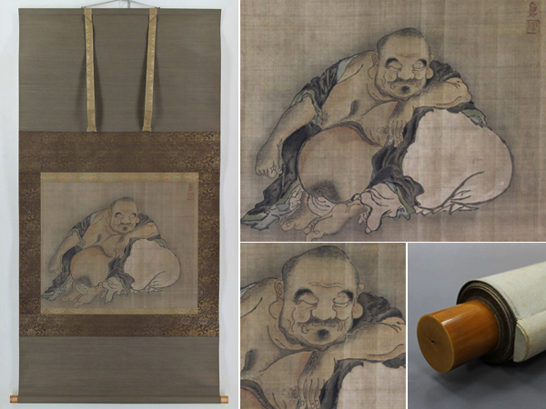 古画 【布袋図】 本紙は、染み、虫食い修復痕があります。 表装は、折れが少しありますが、概ね良好です。 【サイズ】 作品 横約57.3cm×縦約45.8cm 表装 横約72.9cm×縦約142.8cm |