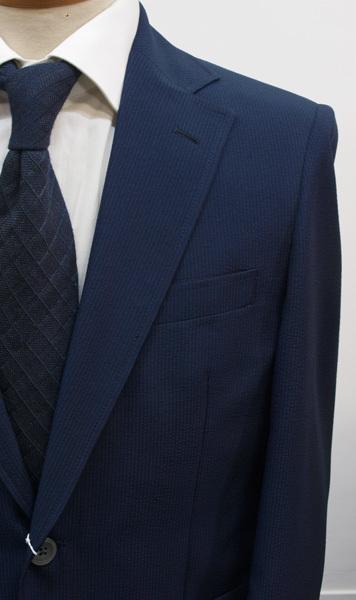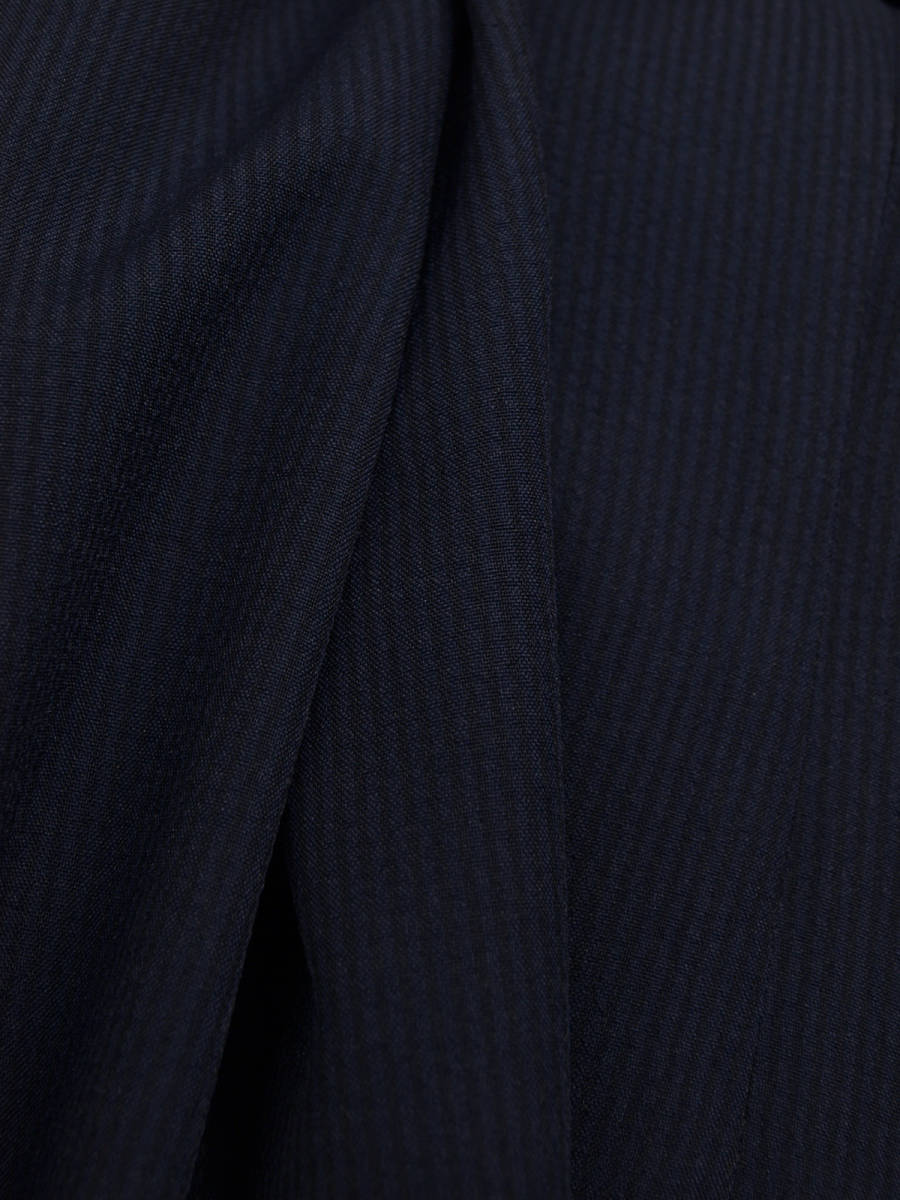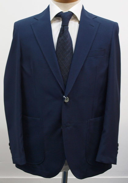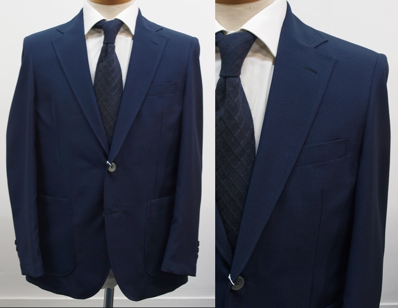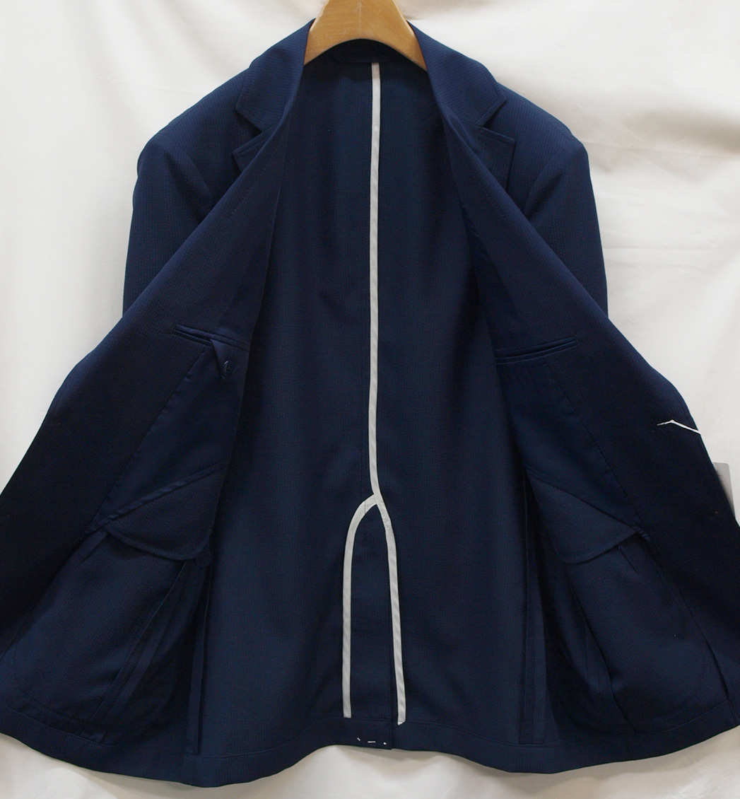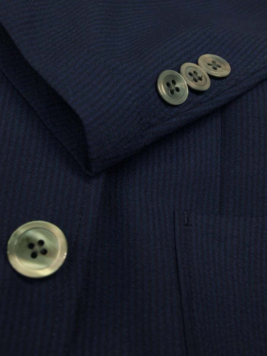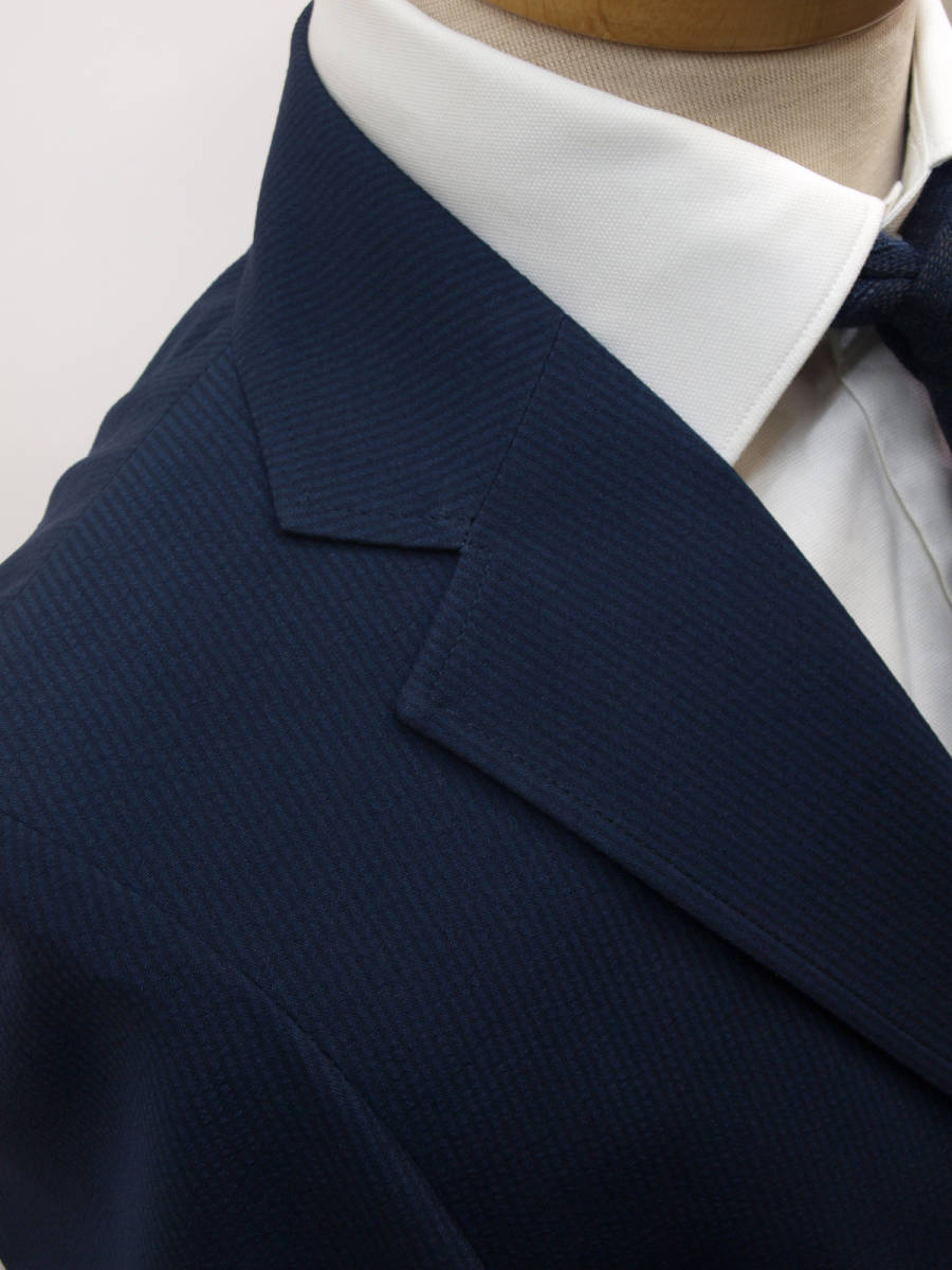 【サイズ】 L(A6、AB6号サイズ相当) 目安の体型 身長170cm~180cm、ウエストサイズ88cmくらいまで 【ジャケット実寸】 肩幅45.5cm 着丈70.5cm 袖丈61cm 脇下部分54cm 身幅50cm 【デザイン】 ・シングル2つボタン、サマージャケット、新品 ・ほどよいゆとりがあるレギュラーフィットタイプ 【仕様】 ・シングル2つボタン、ノッチドラペル、肩パットなし、アウトポケット、筒袖、袖口ボタン3つ、センターベント、内ポケット2つ(小ポケット2つ含む)、背裏なし、袖裏なし きちんとした縫製のビジネス仕様になります。 【素材】 表地:ポリエステル100% 裏地:ポリエステル100% 【色】 濃紺色と黒色つかいのサッカーストライプ ・薄手のポリエステルサッカー生地を使用