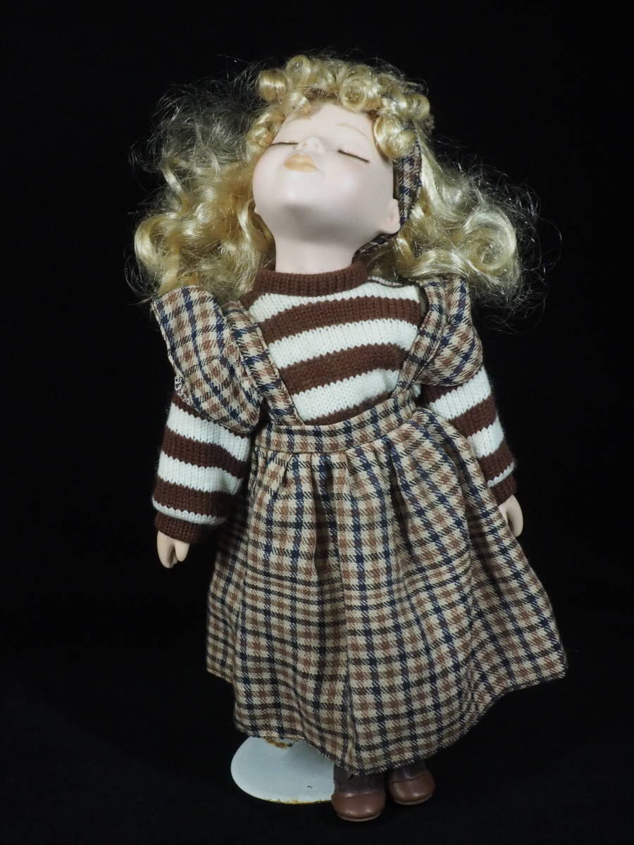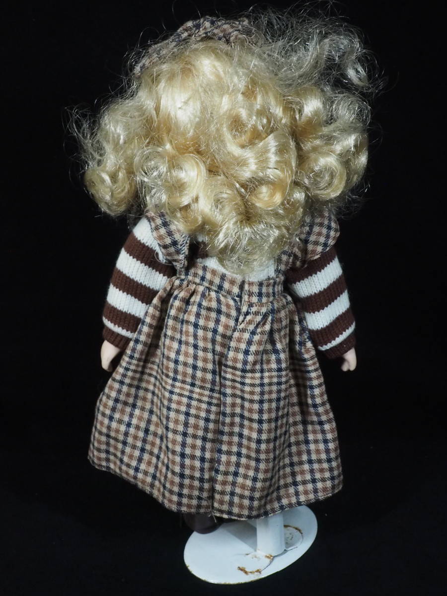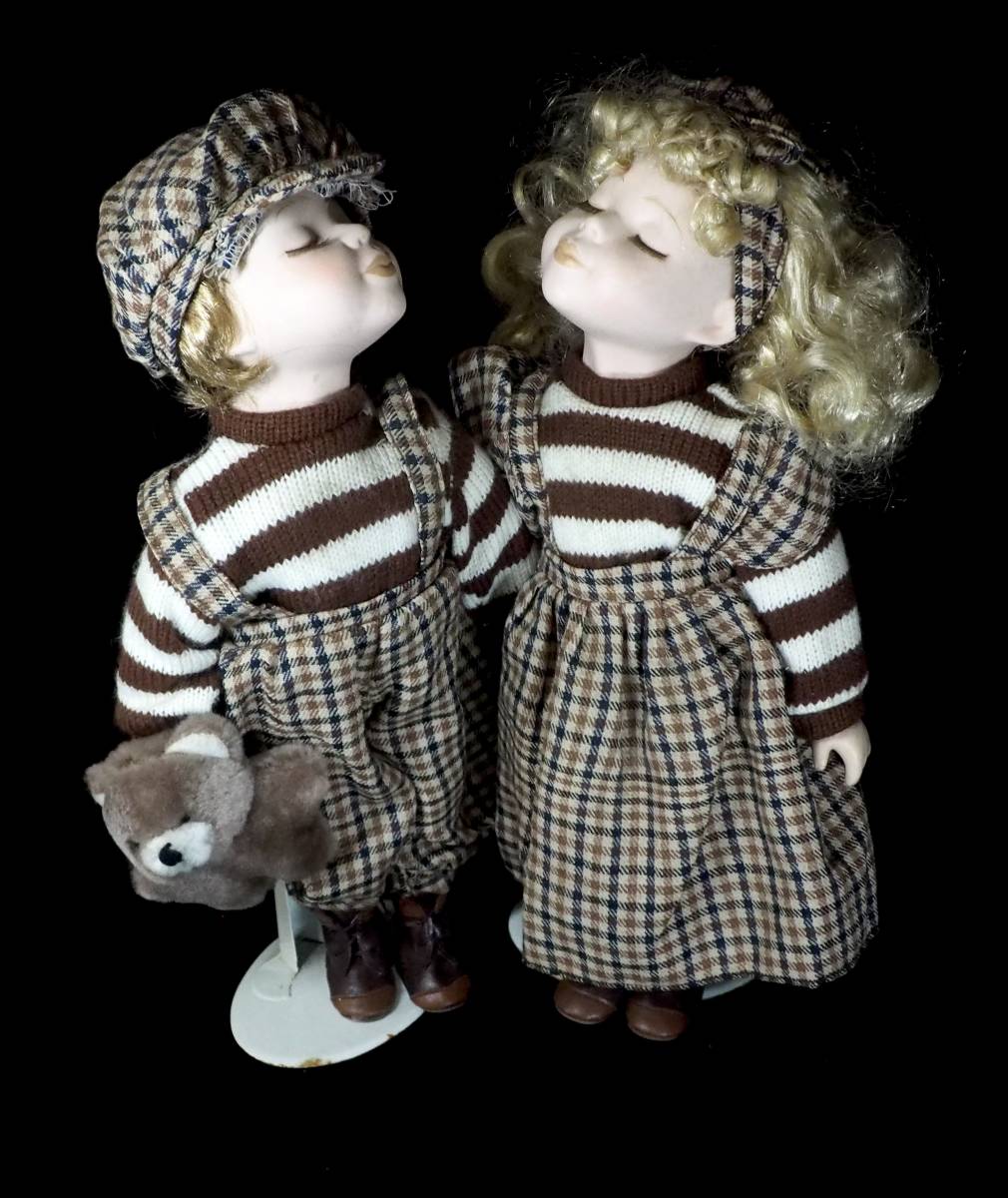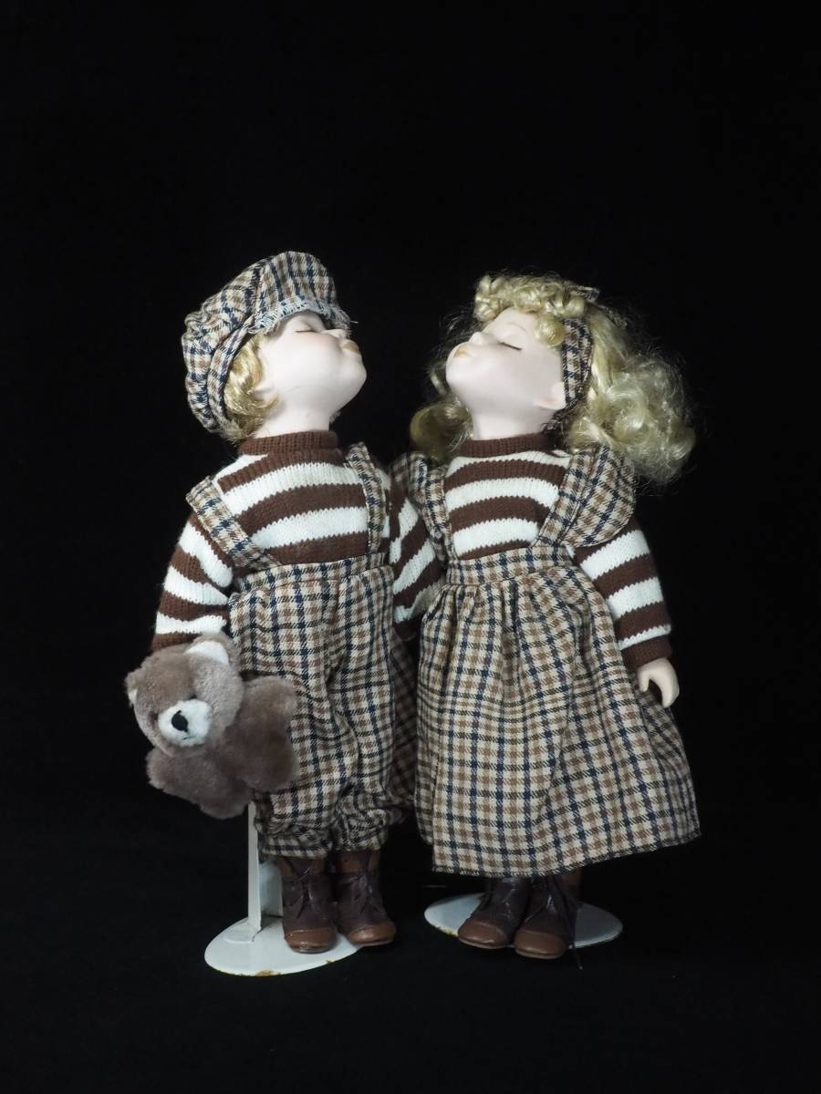 サイズはちょっとしたスペースに飾るのに適したお手頃な大きさで、それぞれドールスタンド付きです。購入時期、メーカー等は不明ですが2体それぞれとても可愛らしいお顔です。お洋服も細かい所まで丁寧に作られてあります。ビンテージ品のため多少の汚れやスタンドの金属にサビなどがありますが、雰囲気が良く味わいのある人形です。