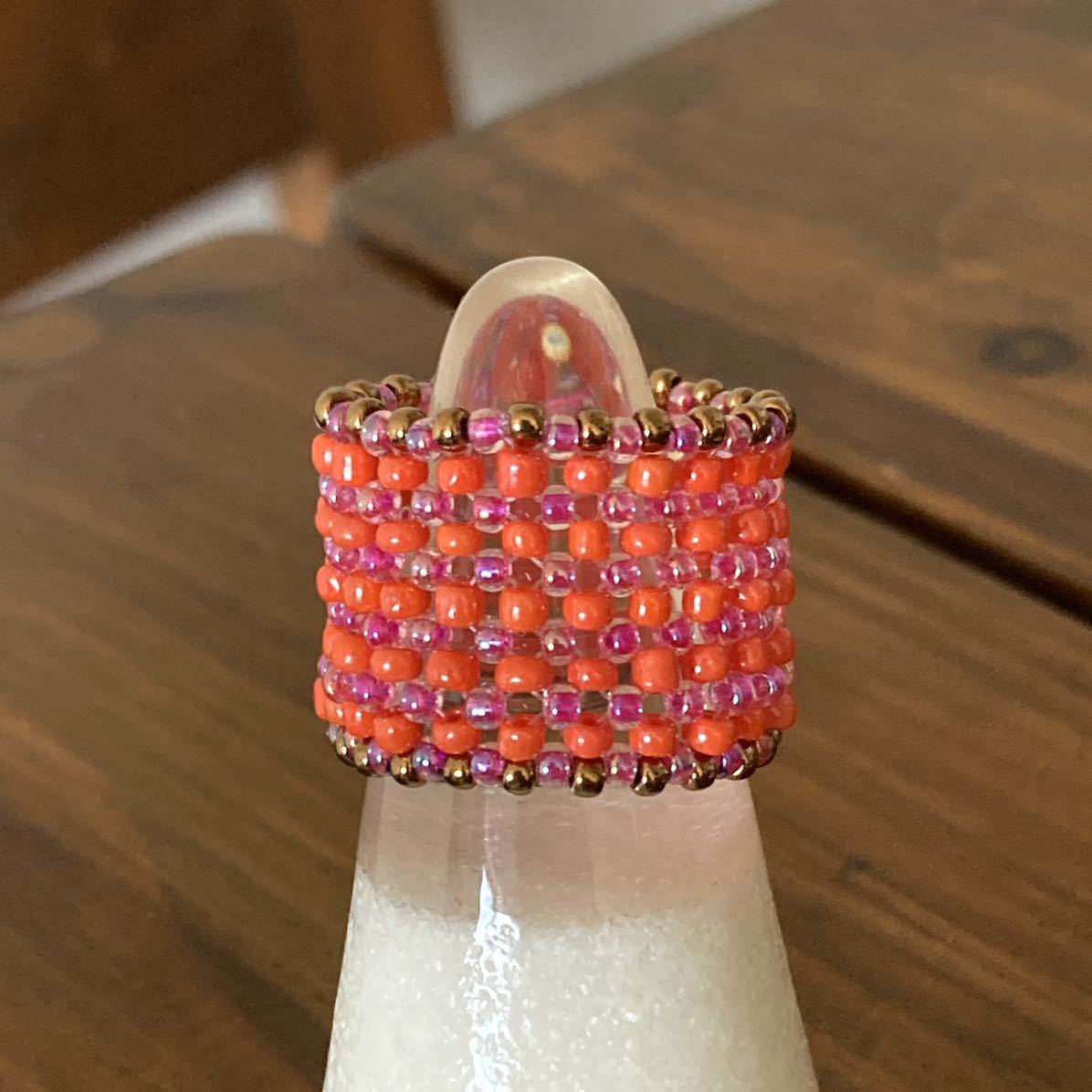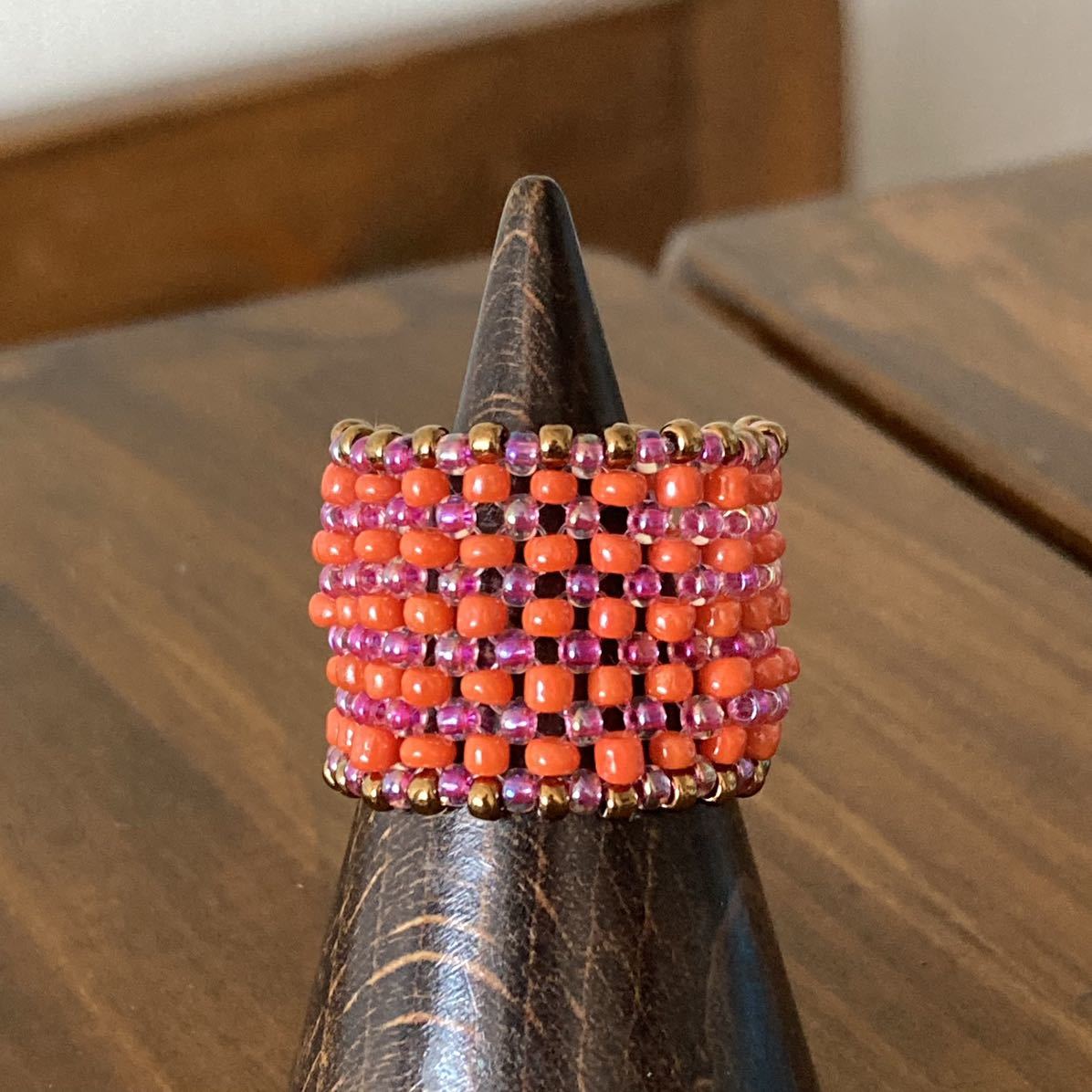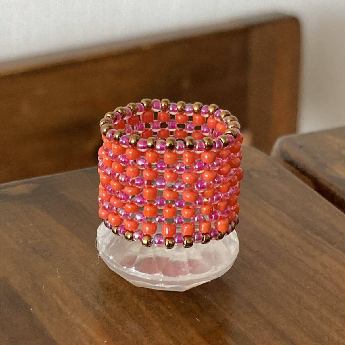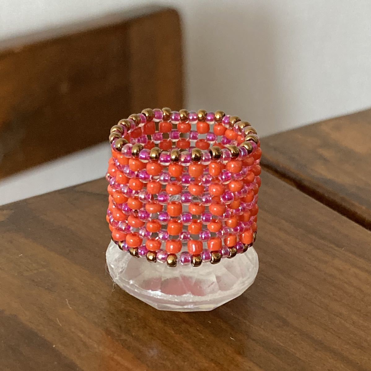 オレンジの丸大ビーズ、ピンク、ゴールドの丸小ビーズで作ったシンプルワイドリングです。