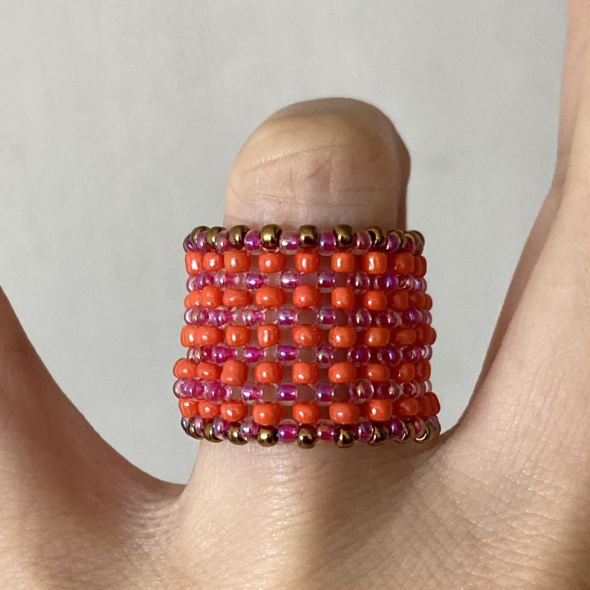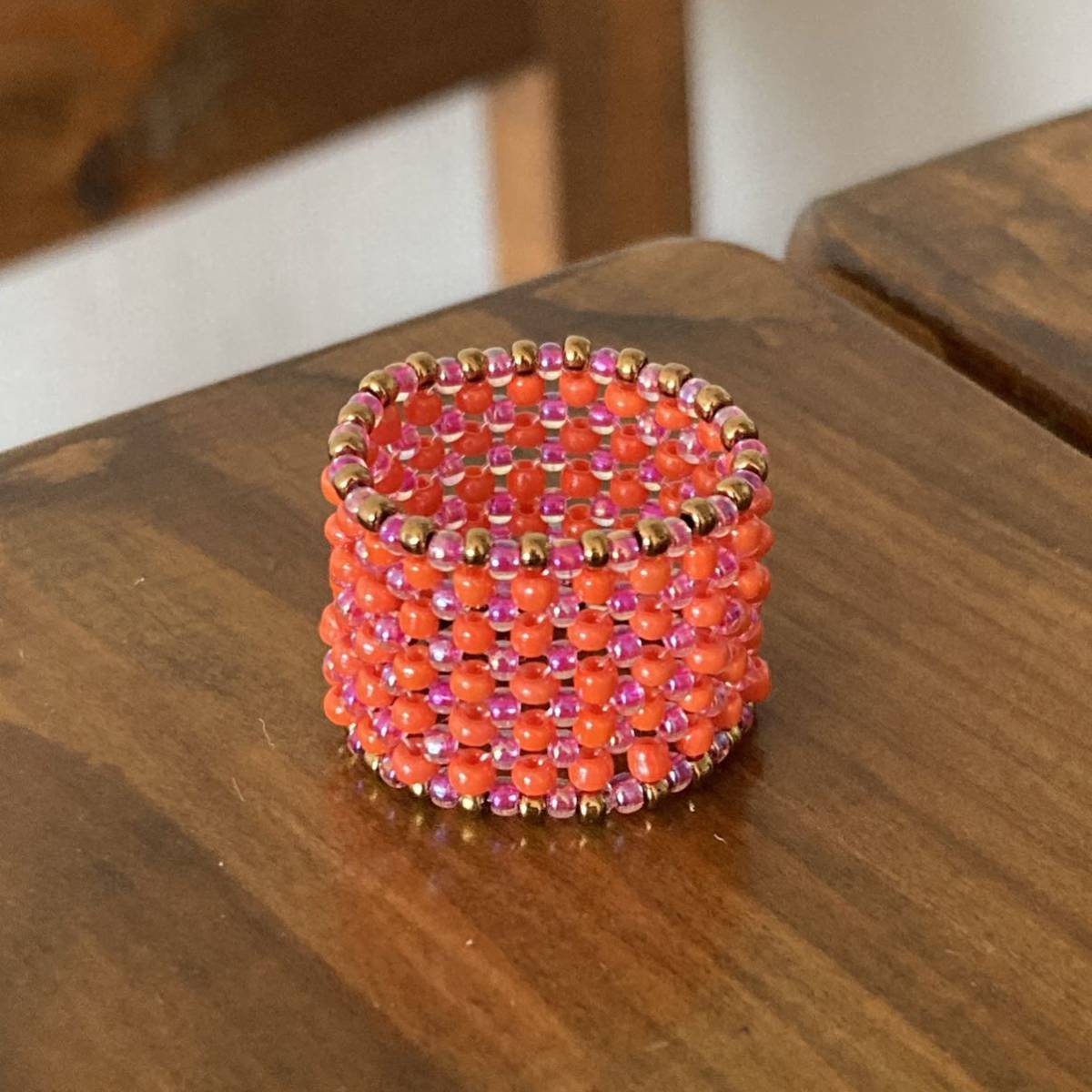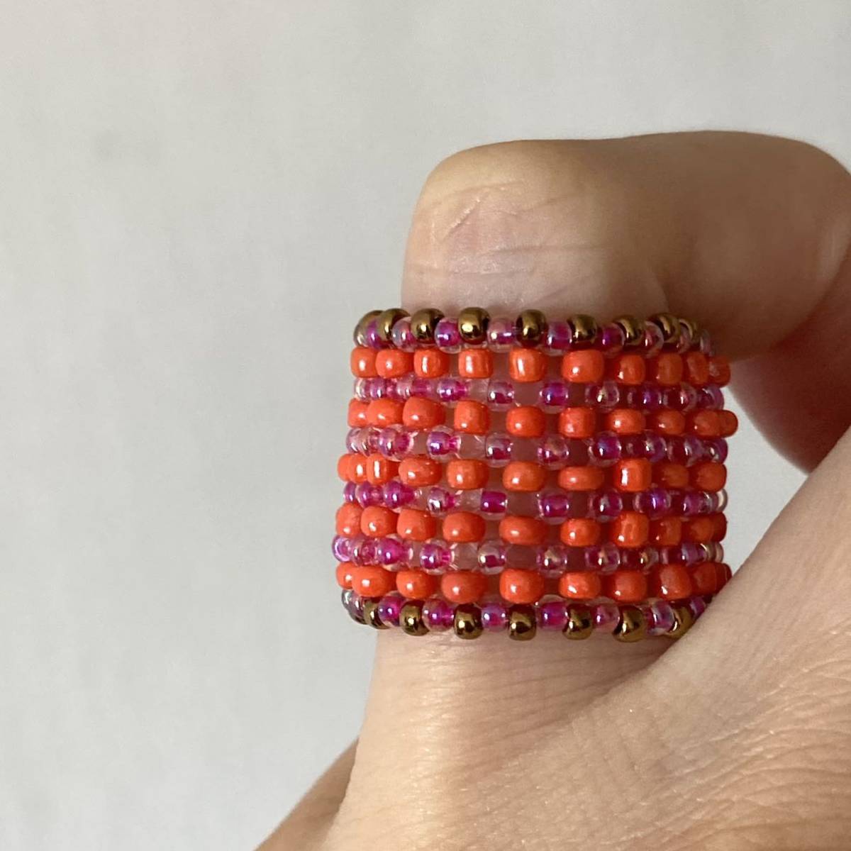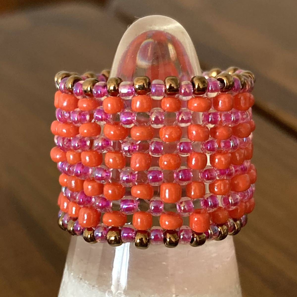 オレンジの丸大ビーズ、ピンク、ゴールドの丸小ビーズで作ったシンプルワイドリングです。