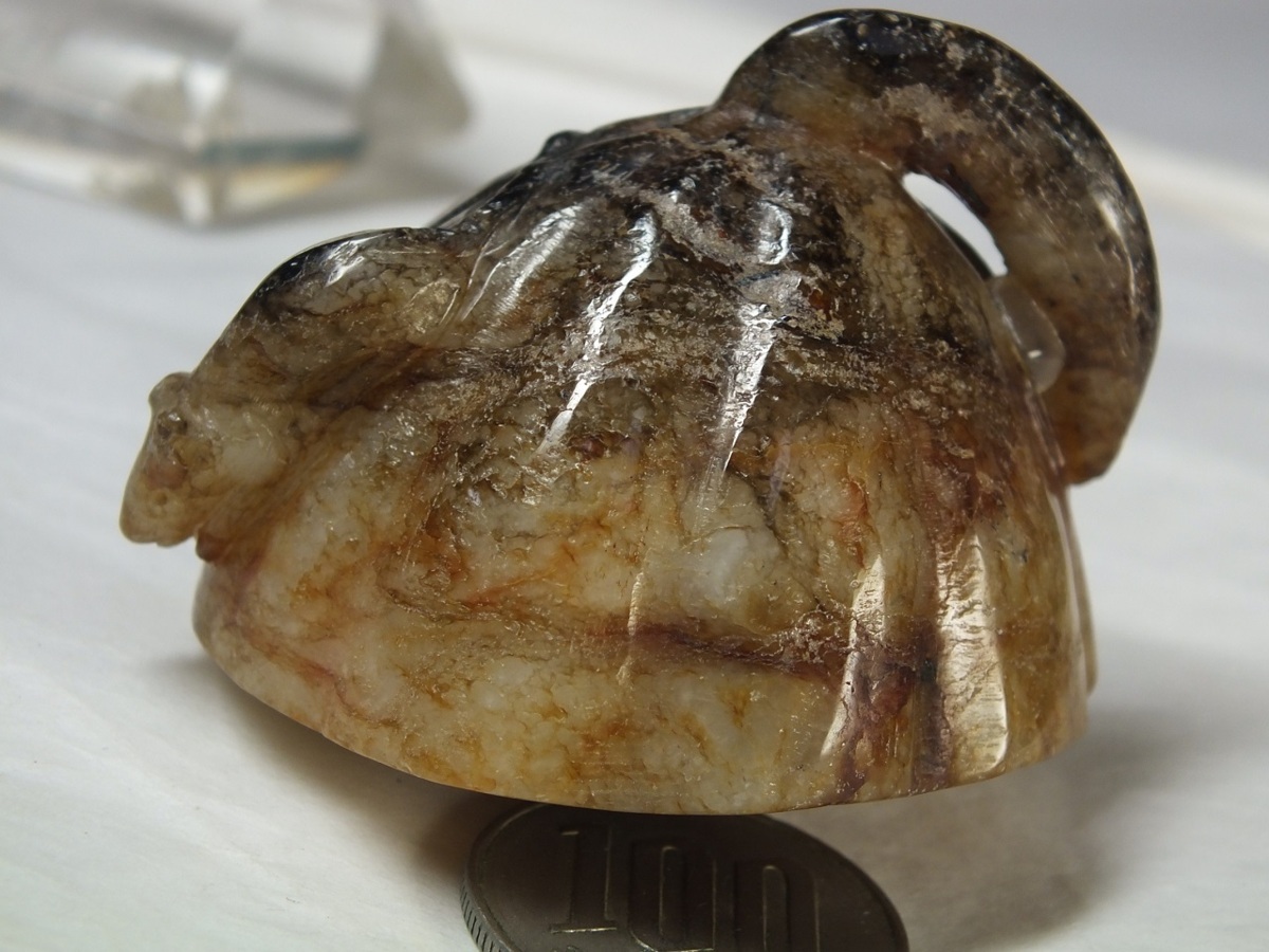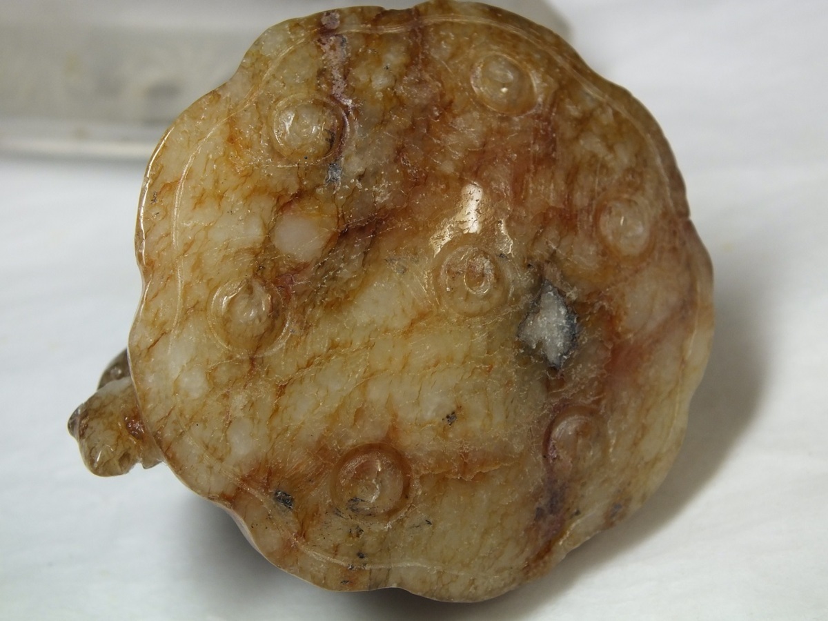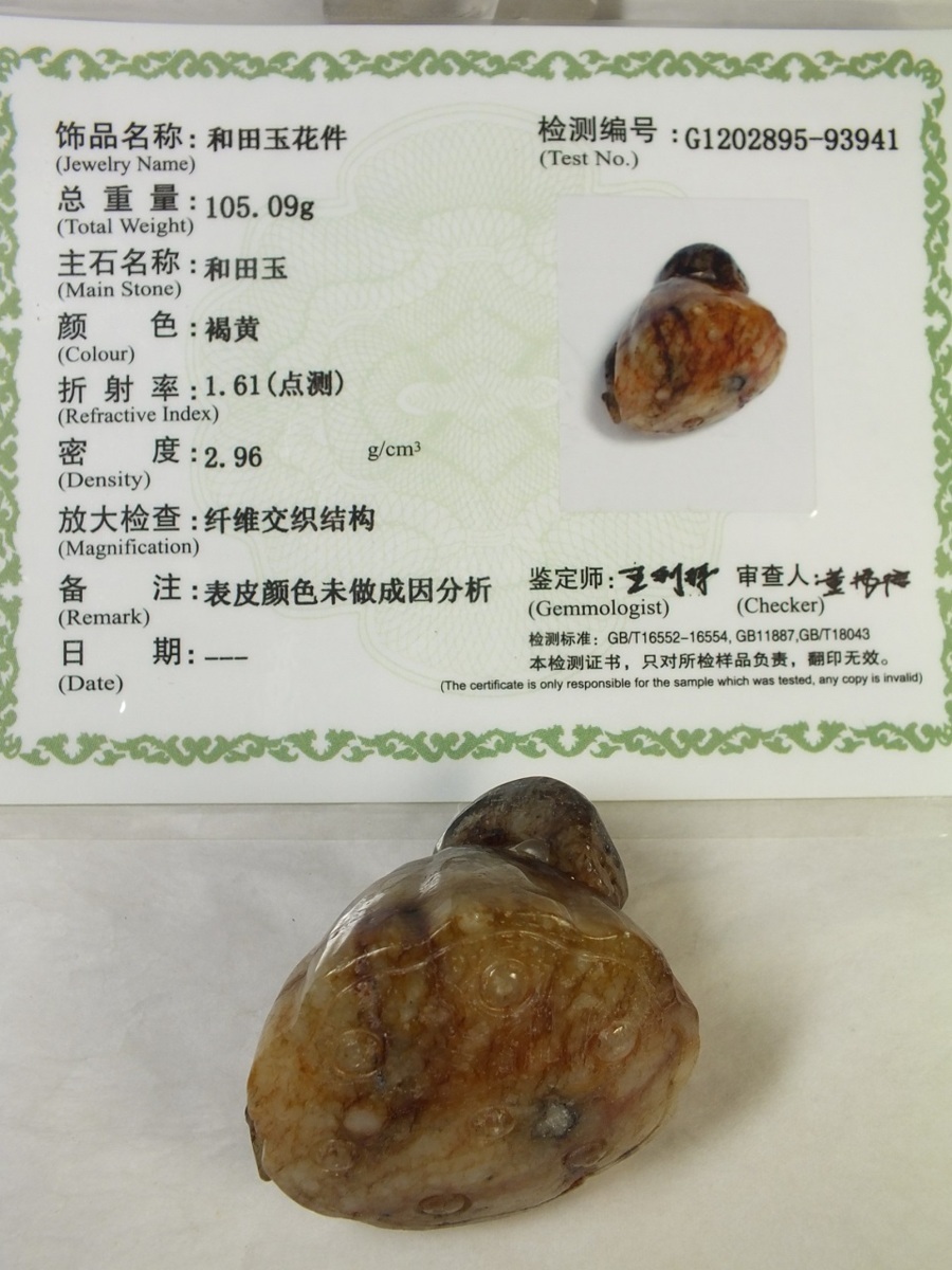 | ▲商品説明▲ | サイズ:53×47×41mm 重さ:105g 今は中国でも貴重な石、旧中国白玉(はくぎょく)です。縁起柄の蓮の実と鼠が彫り込まれています。石コレクションや下げ飾り等に。 ★製造場所・年代など詳細は判りません。 ◎北京市宝玉鑑定所の鑑定証付き。 ●中国の西部砂漠地域(新彊、甘粛)の河床(今は水が無い所)から出る玉(ぎょく)は、中国では和田(ホータン)白玉と呼ばれ、何千年も前から珍重されています。翡翠の照りとは違い、ねっとりとした潤いがあります。中国の玉(ぎょく)コレクター垂涎の石です。 |