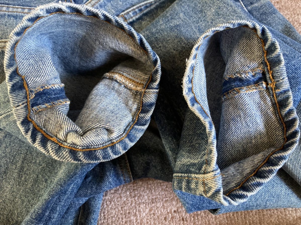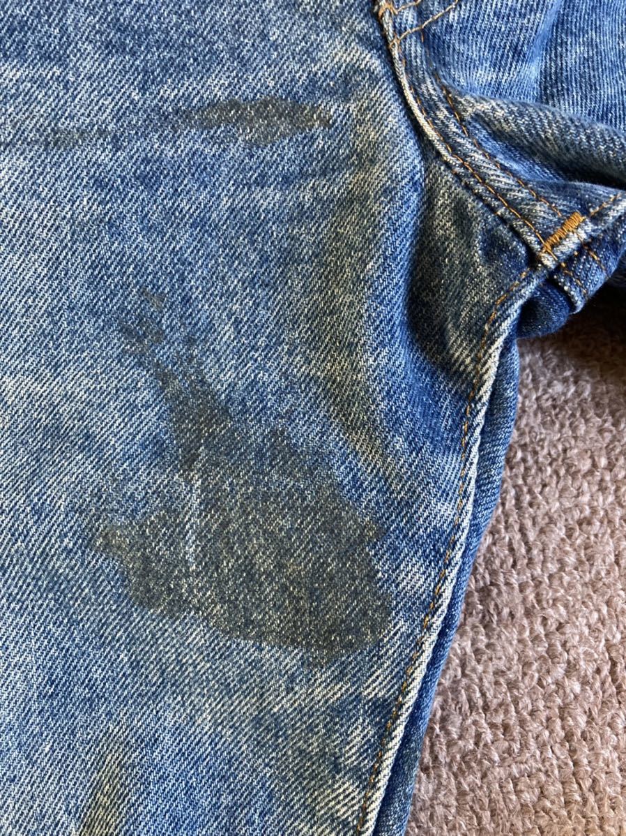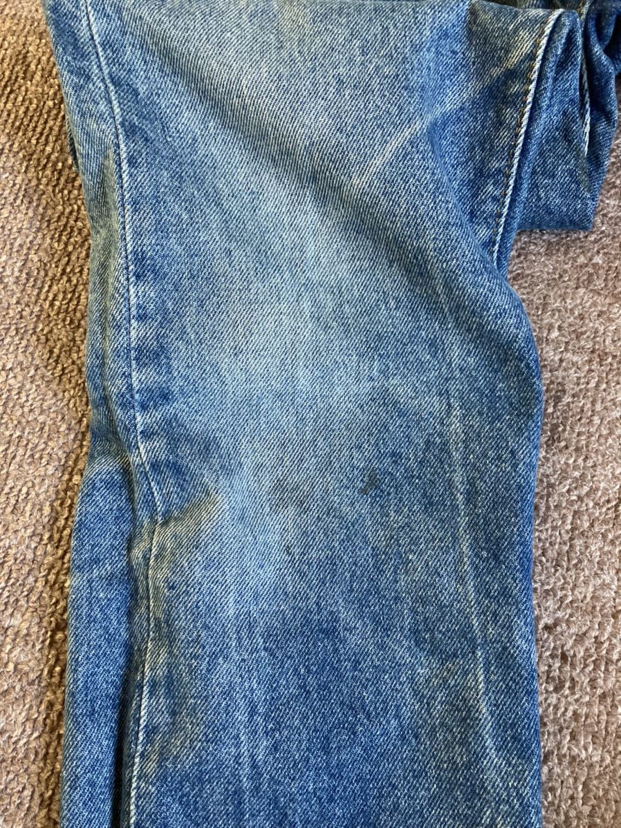 全体的な使用感、色落ち約50%(色残り約50%)、フロント右の太もも部分と膝下部分に汚れ付着あり、両裾後ろ側の生地の擦り切れあり、紙パッチ上部1箇所に欠損あり、右バックポケットに色落ちあり、内部のケアタグは取れかけていたため、一度外し、再度縫い付けリペア済みで、文字は全て読み取れます。