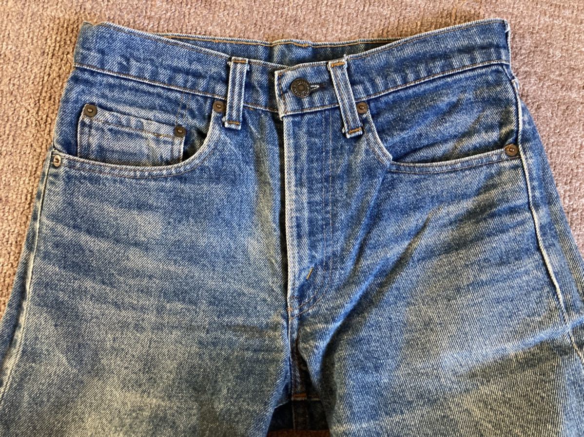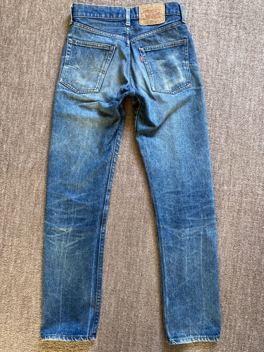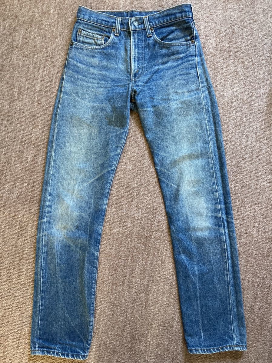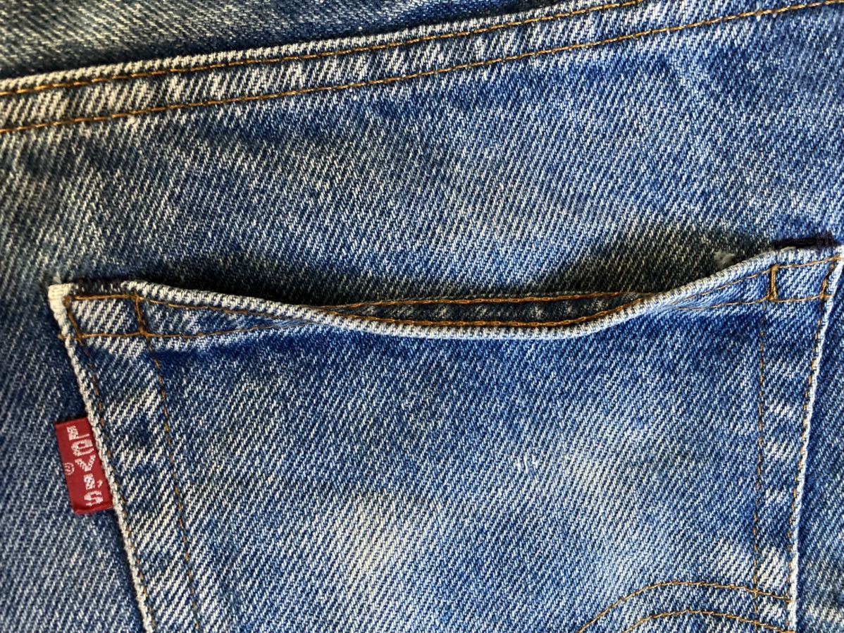 全体的な使用感、色落ち約50%(色残り約50%)、フロント右の太もも部分と膝下部分に汚れ付着あり、両裾後ろ側の生地の擦り切れあり、紙パッチ上部1箇所に欠損あり、右バックポケットに色落ちあり、内部のケアタグは取れかけていたため、一度外し、再度縫い付けリペア済みで、文字は全て読み取れます。