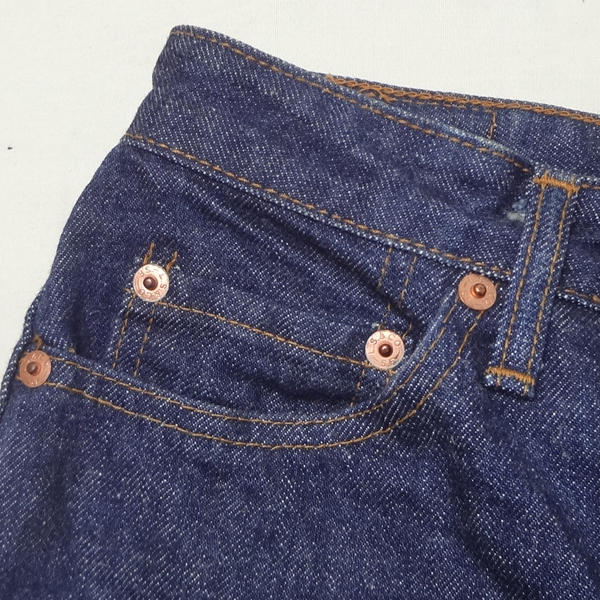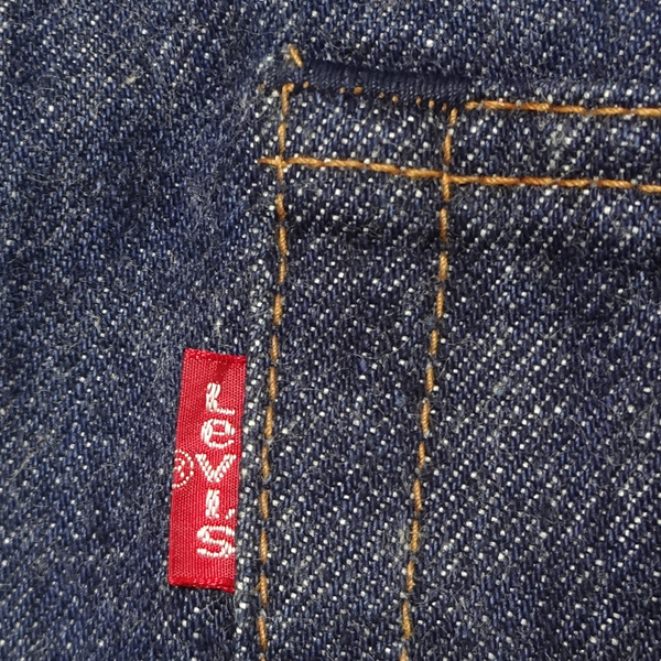 ・スモールeレッドタブ、アーキュエットステッチ、5ポケットリベット、ジッパー使用、ペーパーパッチ