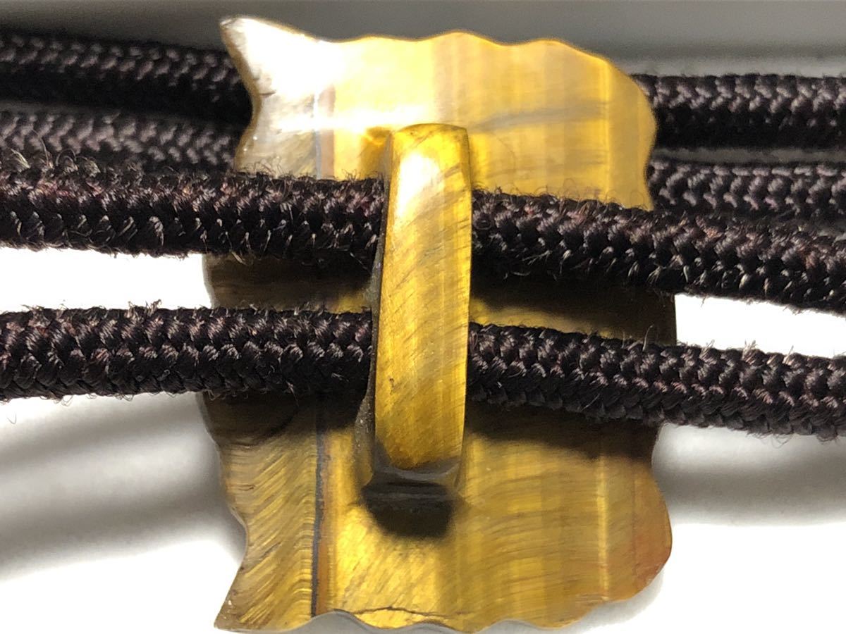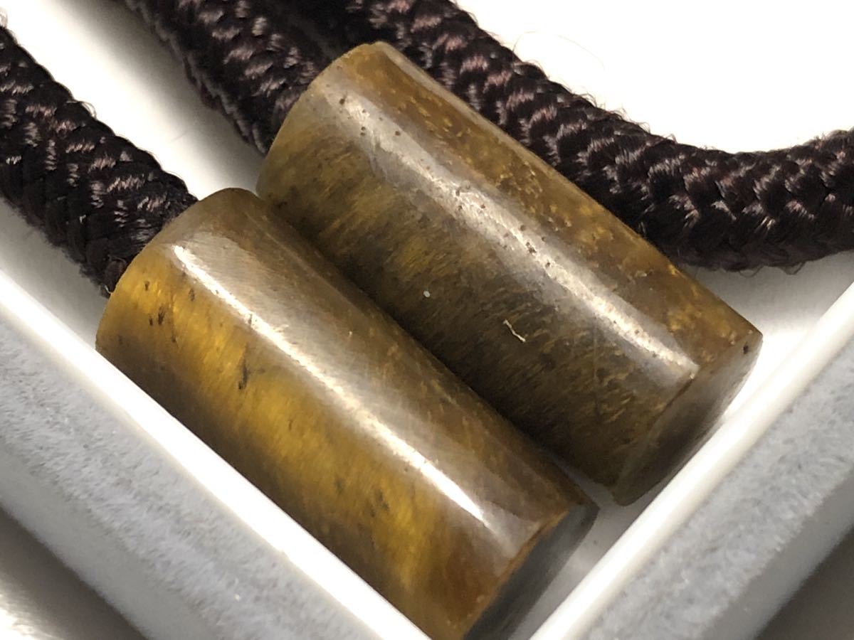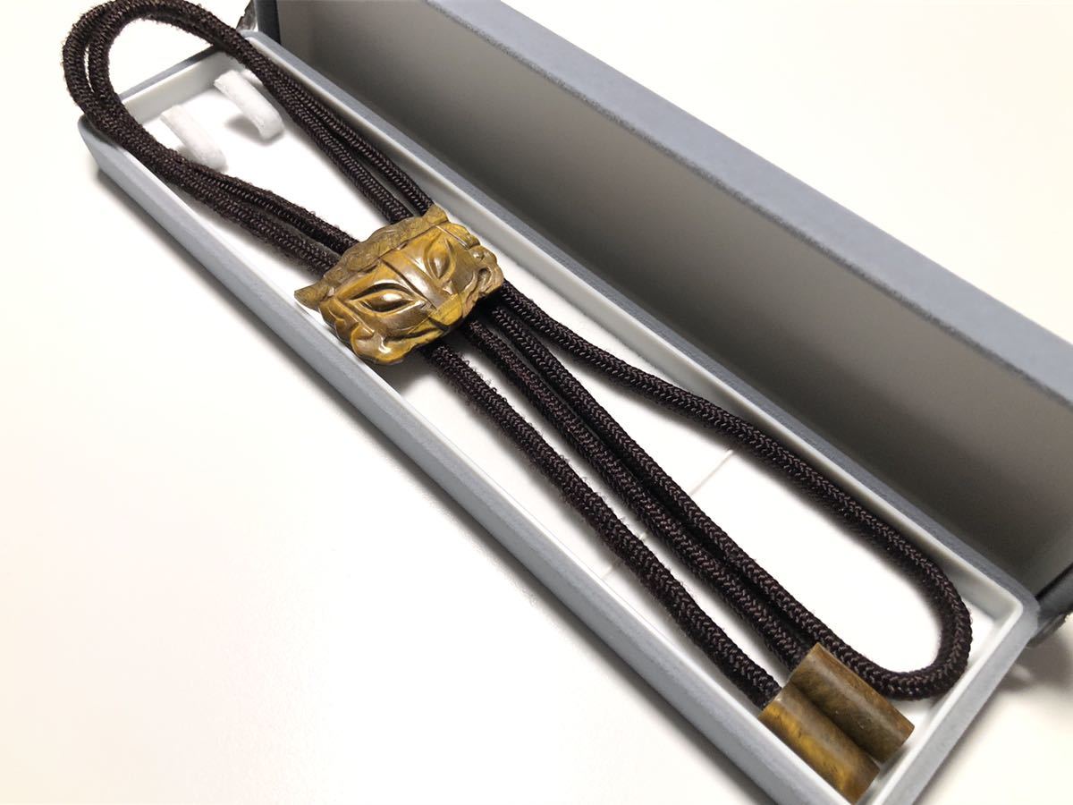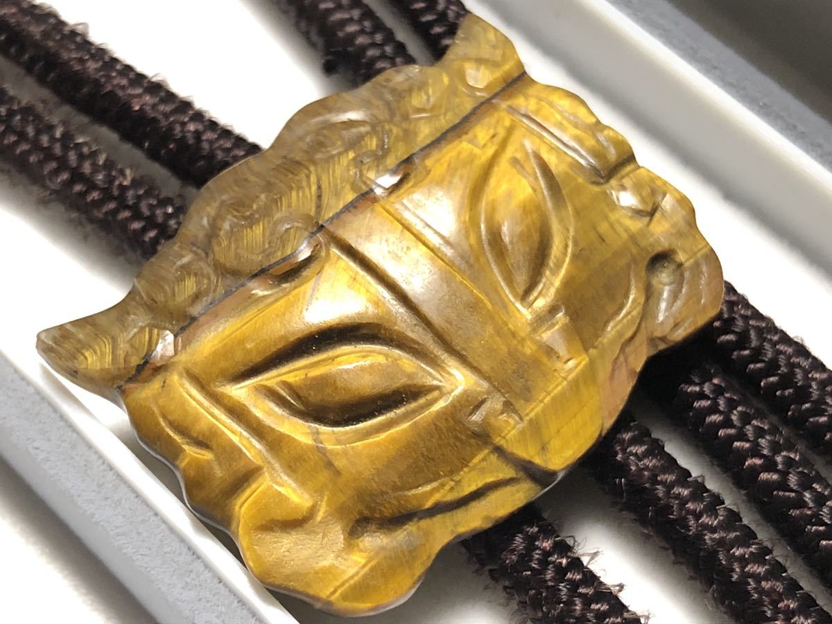 タイガーアイ(虎目石)を使用した、唐獅子細工のループタイです。紐部分にほつれがあります。