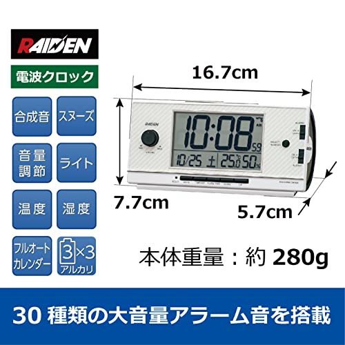 レトロ・07:白 77×167×57mm NR539W・・Color:07:白PatternName:03:選べるアラーム音(30種)・付属品:電池(単3アルカリ×3個)・電波修正機能(40kHz/60kHz自動選局・受信OFF機能つき)、大音量電子音アラーム(30パターン)・アラーム2チャンネル、アラームオートストップ機能(約5分間)、スヌーズつき、音量調節・アラームモニター機能、ライトつき、2099年までのフルオートカレンダー機能・温湿度表示(温度測定範囲:0℃~40℃ 測定精度:±2℃ 湿度測定範囲:25%RH~85%RH 測定精度:±8%RH(25℃))、12時間制/24時間制切替式圧倒的大音量アラーム「ライデン」シリーズ 電子音30パターン搭載 スタイリッシュでシンプルなデザイン ●選べる30パターンのアラーム音と音量調節機能 EDM(エレクトロニック・ダンス・ミュージック)、サンバなどの元気が出そうなサウンド、 朝ごはん(野菜を刻み朝食の準備をする音)、ニワトリの鳴き声などの朝ならではのサウンド、 目ざまし時計らしい電子音、ベル音等々、合計30パターンのアラーム音を内蔵しました。 ボリュームノブが本体前面にありますのでボリュームもお好みに合わせて簡単にセッティングできます。 アラーム音30種 01 EDM 02 ドラムス 03 レトロゲーム 04 シューティング 05 レベルアップ 06 カキーン 07 バトル 08 モンスター 09 ドーン 10 ファンタジー 11 鐘 12 サスペンス 13 マジック 14 サイレン 15 バイク 16 電気 17 足音 18 ロボット 19 バブル 20 ギター 21 ガラス 22 サンバ 23 朝ごはん 24 カウントダウン 25 タイピング 26 ドラムンベース 27 コケコッコー 28 バイブ音 29 電子音 30 ベル音 ●充実の機能 アラームは2チャンネル設定できますので、在宅と出勤日、 平日と休日など別々のアラーム時間をセットできます。 また、温度・湿度表示機能も備えており、気になるお部屋の環境も確認できます。 ◆標準電波クロック 正確な時刻情報をのせた電波を受信し、 自動的に表示時刻を修正するクロックです。 ご使用の際は、 できるだけ電波を受けやすい窓際などに置き、 電波ノイズの発生する場所は避けてください。 ●電波を受信していないときは、クオーツの精度で作動します。 ●また以下のような場所では正確に受信できない場合がありますので、 あらかじめご了承ください。 ・ビルの中、ビルの谷間、地下。 ・高圧線、テレビ塔、電車の架線の近く。 ・テレビ、冷蔵庫、エアコン、空気清浄機、パソコン、ファクシミリ等の 家電製品やOA機器の近く。 ・工事現場、空港の近くや交通量の多い所など、 電波障害の起きる所。 ・乗り物の中。(自動車、電車、飛行機など。) ・その他電波ノイズを発生させるものの近く。 ・スチール机等の金属製の家具の上や近く。 ※受信可能地域以外でも条件によっては受信可能な場合があります。 ◆合成音 ICに合成した音でアラーム時刻をお知らせします。 ◆簡単デジタル 前面の進む・戻るボタンで目ざまし時刻を設定できます。 ◆スヌーズ アラームを止めても数分後に再び鳴り出す機能です。 ◆音量調節 メロディやアラームの音を細かくボリューム調節できます。 ◆ライト 小さな電球やLEDライトが文字板面を照らす機能です。 ◆フルオートカレンダー うるう年でも修正がいらないカレンダーです。 ◆温度 温度を表示します。お部屋のコンディション管理に便利です。 ◆アラームモニター アラーム音をアラームセット時刻以外にも聞くことができます。