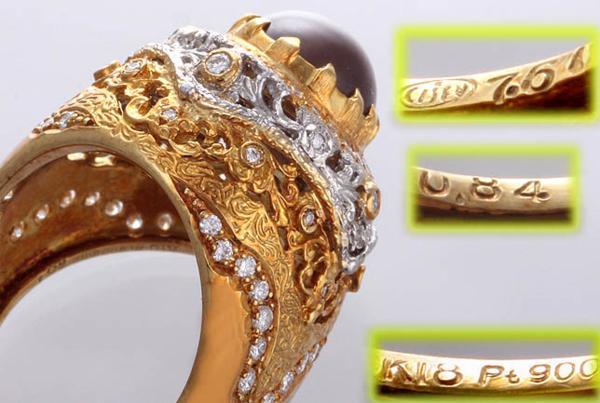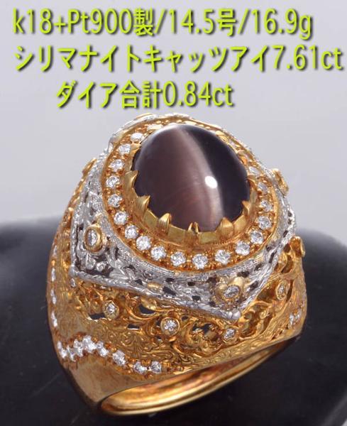| マテリアル | 天然シリマナイト7.61カラット(カラット刻印あり)、天然ダイア石計0.84カラット(カラット刻印あり)、k18+プラチナ900製 |