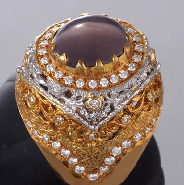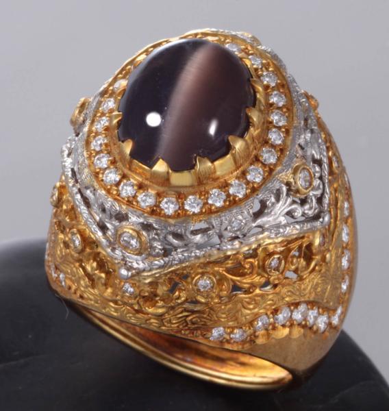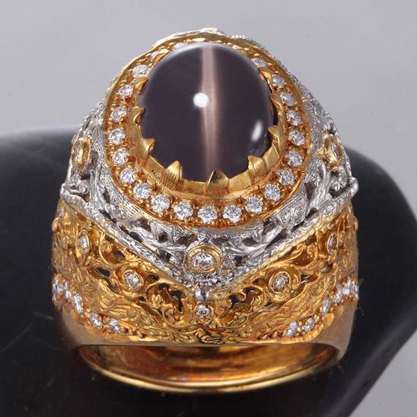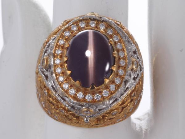 | コメント | [[全ての商品に品質保証カードが付きますのでご安心ください]] 大迫力のリングです。プラチナとゴールドを贅沢に使い、見事な造形を作り上げています。主石を鑑定してもらいました。この宝石名は、シリマナイトで、キャッツアイ効果のあるものです。数多くの宝石を出品してきましたが、初めての出品になります。どんな光でもキャッツアイが出現します。受ける光によりますが、シャープで綺麗なキャッツアイです。このシリマナイトが7.61カラット、脇石のダイアは合計で0.84カラットの刻印があります。 |