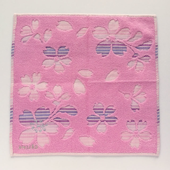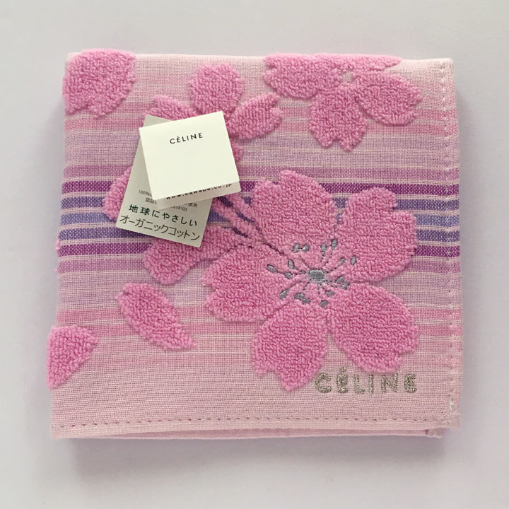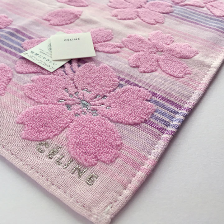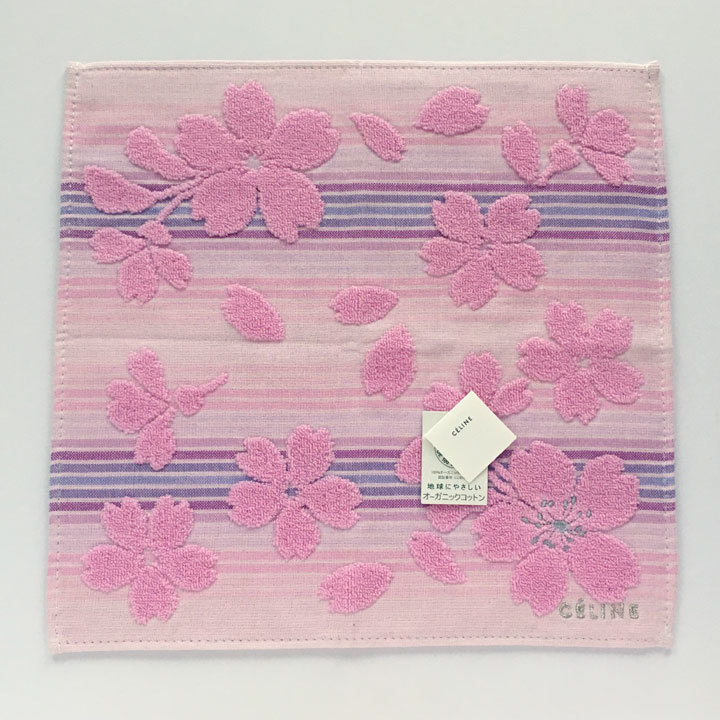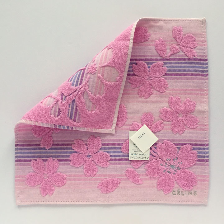 セリーヌ / CELINE タオルハンカチ 桜の花柄 表ガーゼ グラデーションストライプ生地 ピンク【4615】