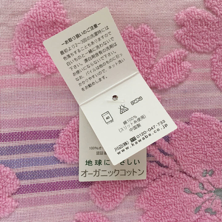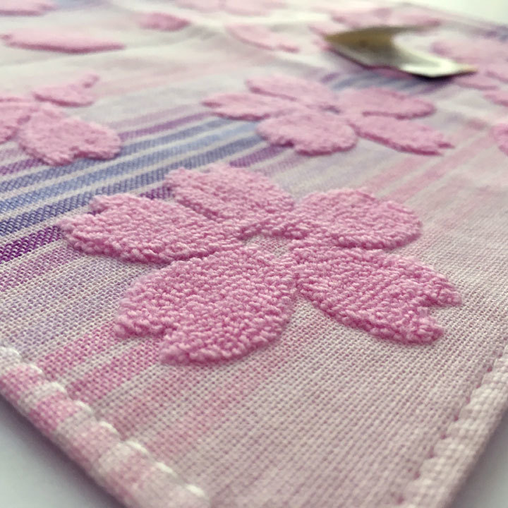 グラデーションストライプの生地に、ピンクの桜がパイルで浮き上がるようにデザインされています。