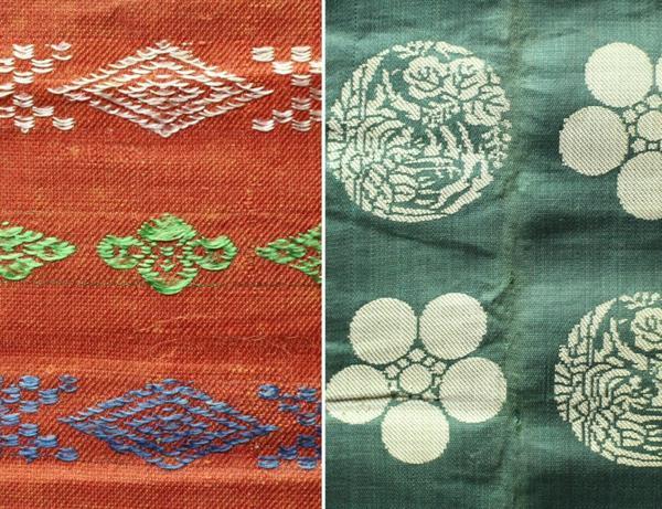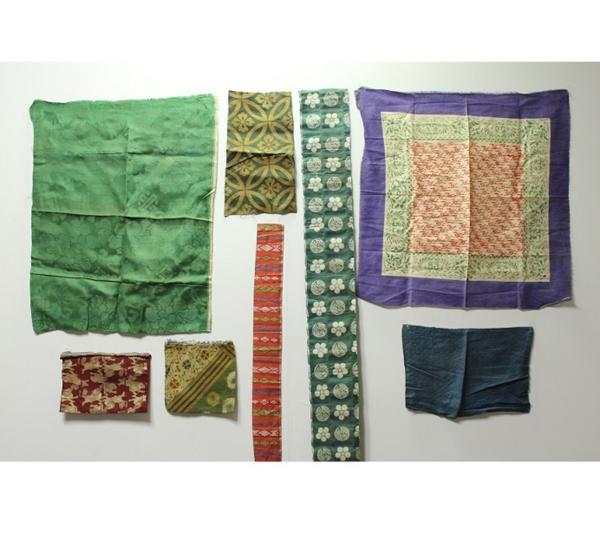 素材:正絹・他。巾着:サイズ約19.5cm×21.5cm。ファスナー付ケース:サイズ約17cm×25.5cm。布:緑系>サイズ約68cm×55.5cm、赤茶>サイズ約7cm×78.5cm。深緑・白>サイズ約13.5cm×163cm。深緑・黄茶>サイズ約18cm×30cm。雑巾風:サイズ約26cm×37cm。風呂敷?:サイズ約62cm×65cm。