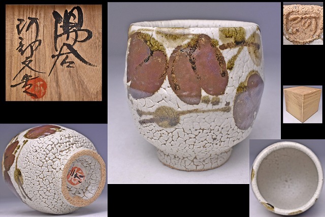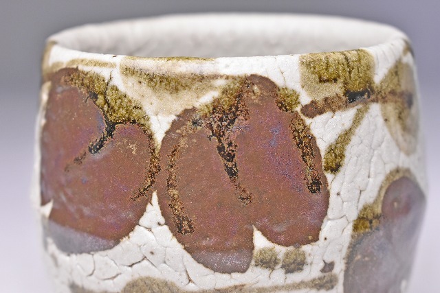 阿部文貴 ★ 益子焼 湯呑 ★ 共箱 ★ 糠釉 鉄絵 梅花皮 アケビ文 ★ 大振りで小服茶碗でも使えそうな大きさの景色豊かな逸品 ★