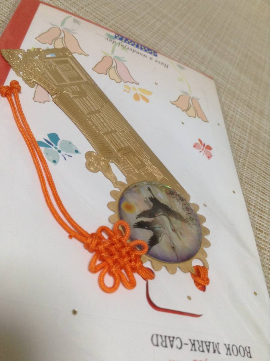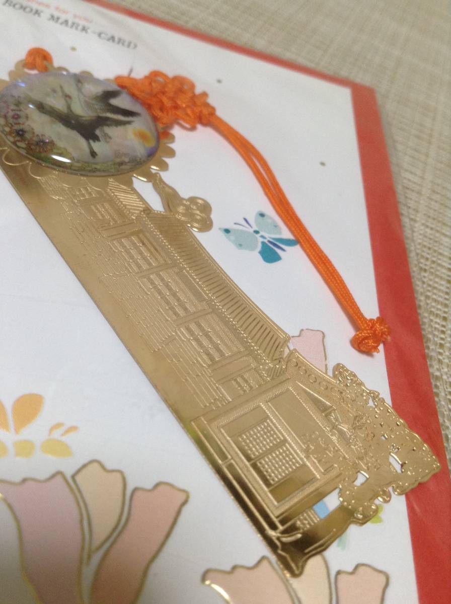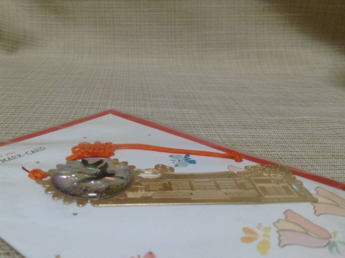ブックマークカード 天然螺鈿製品 シルク印刷技法 しおり,栞,ブックマーカー 韓国(?) 建物 鶴(?)