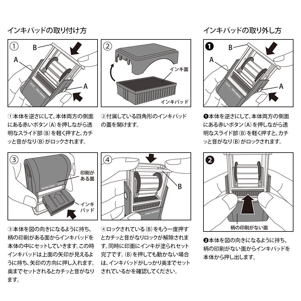 仕様:素材/本体:ABS+POM+ポリカーボネート+バネ鋼材製 印面:ゴム製 12柄 インキパッド付(油性顔料系黒インキ:ABS+ウレタン製)〔フック対応PETケース入〕