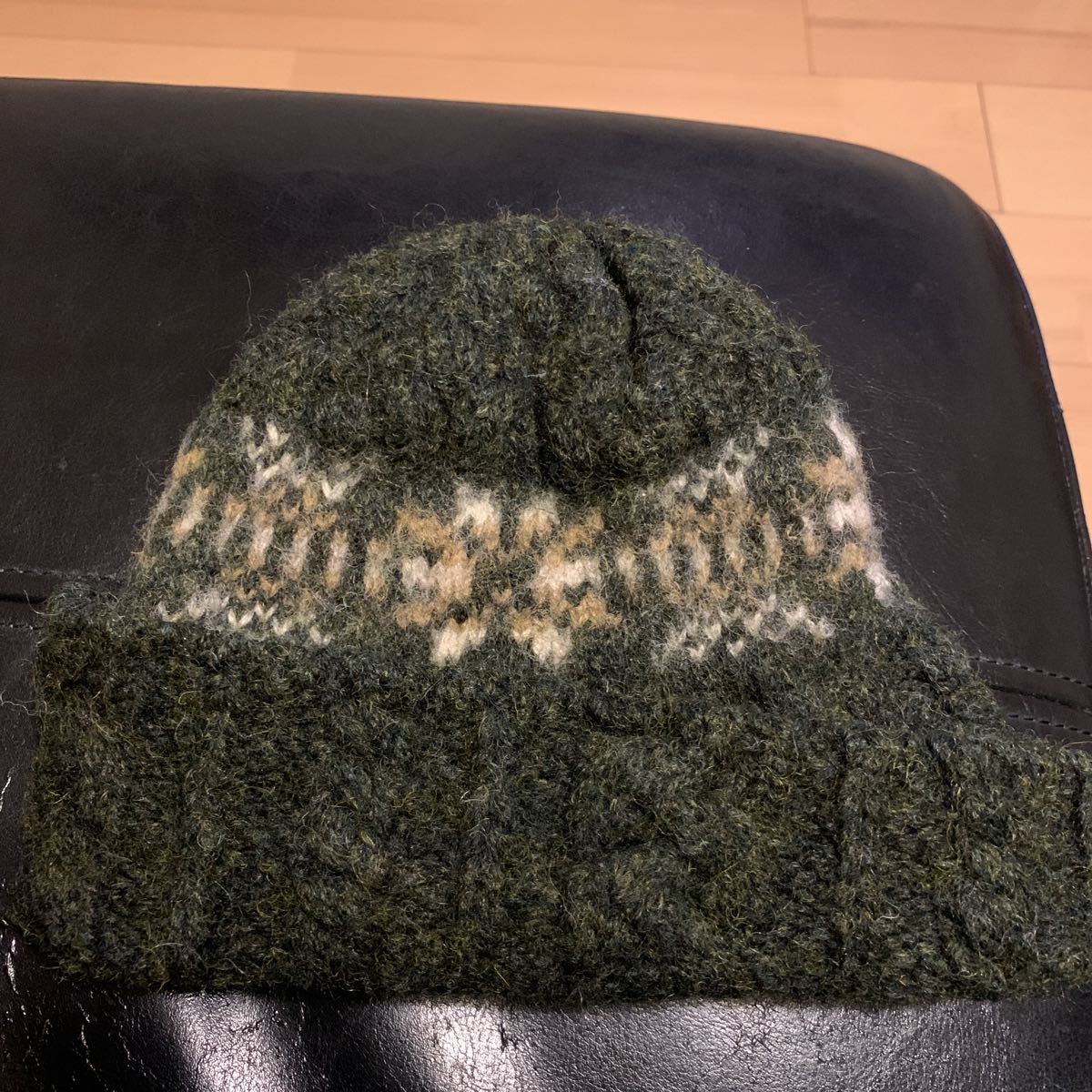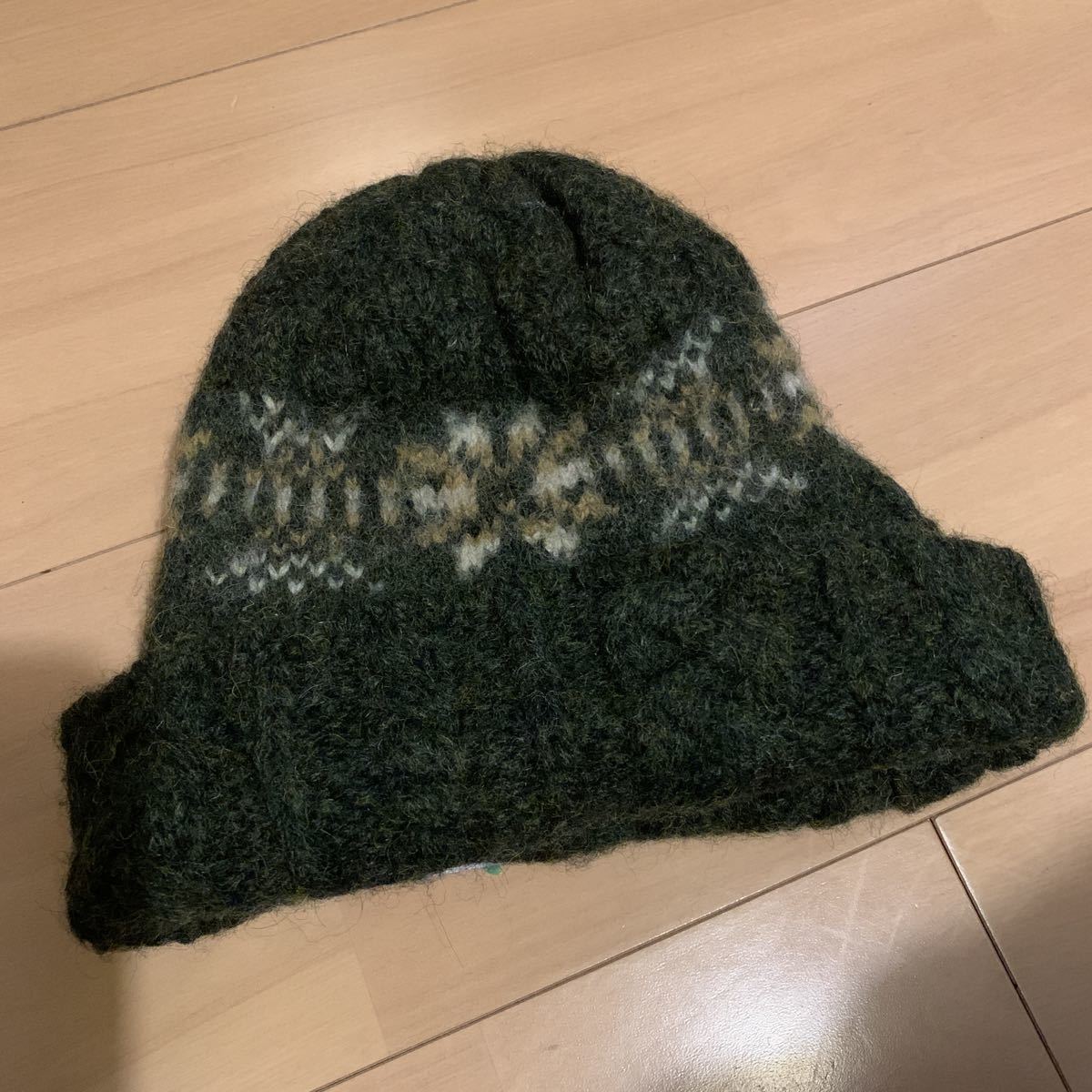 色は濃いオリーブでノルディック柄です。