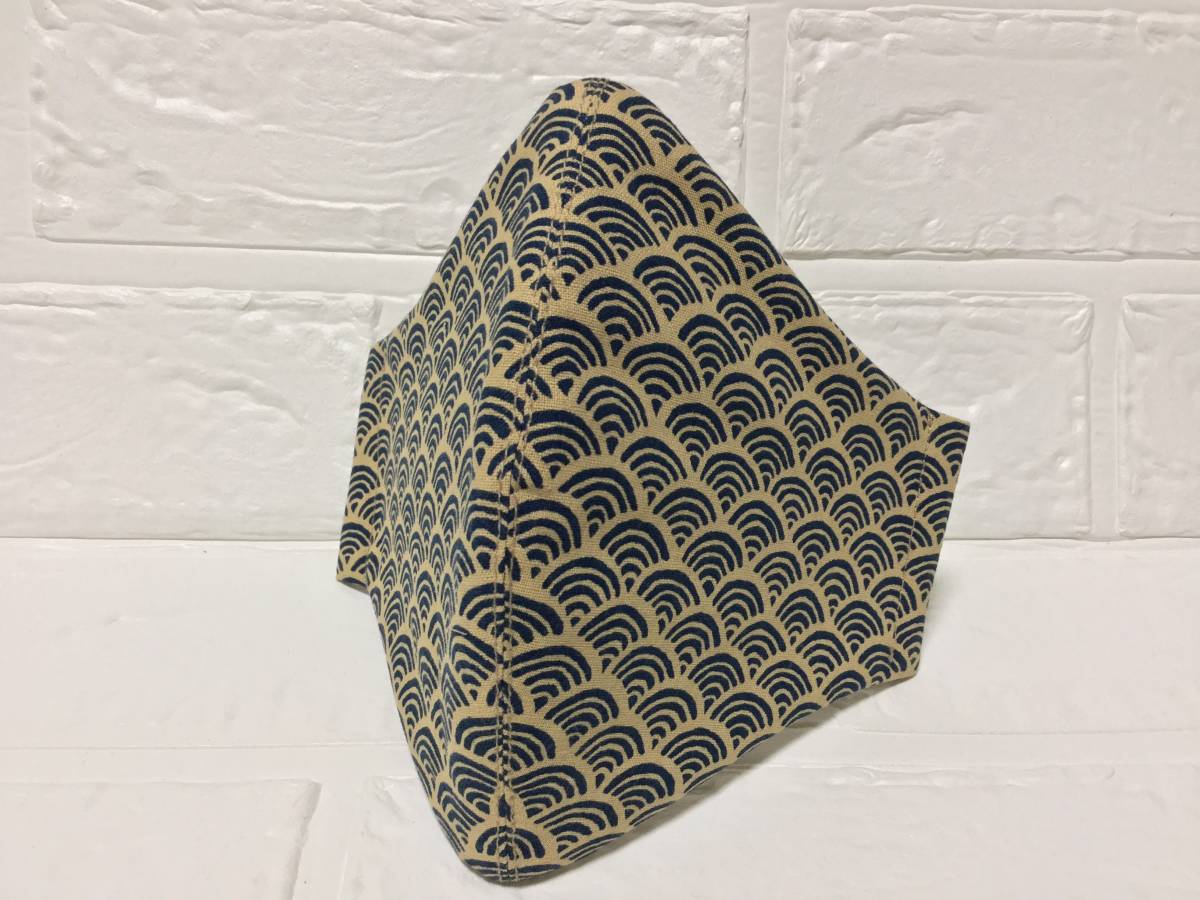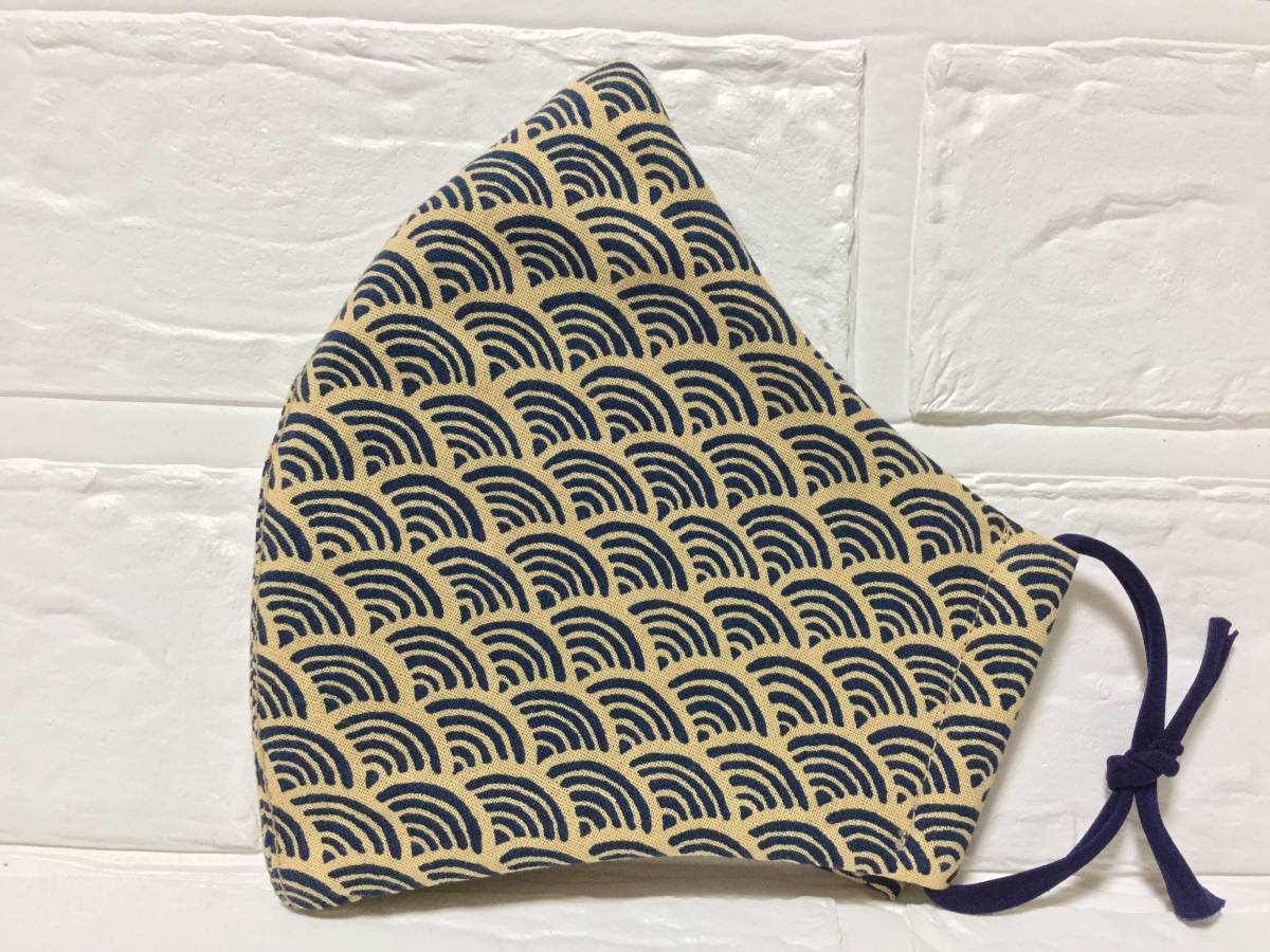 ※独自の型紙でスタイリッシュに仕上げました。ふんわり感を出す為に縁取りのステッチを施してありません。横幅を広目にとり、耳に近い縦の幅を狭めて小顔効果も♪ 両サイドはゴムも通せます。カッコいい青海波の和柄が癒されますね。 裏地も汚れが目立ちにくいブラウンの綿素材を使用し、サラッと仕上げました♪ 画像最後の紐(ネイビー:80円)は別で出品しております。尚、素人が製作した為、完ぺきなお品を期待される方はご入札をご遠慮くださいませ。