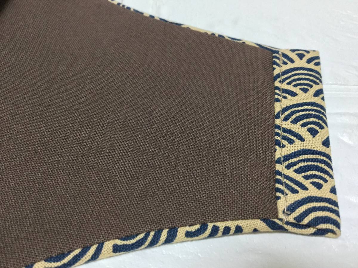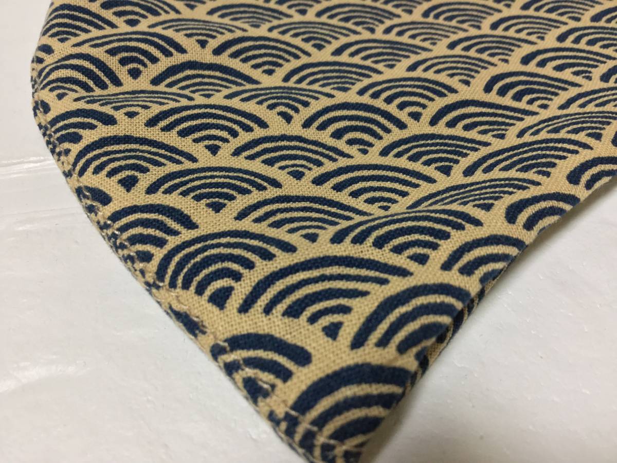 ◆お色・素材・size◆ 生成り・ネイビー。和柄(青海波)。表側:綿100%。裏側:ブラウン。シーチング綿100%(サラッとしてストレスを感じにくい素材です)。横最大(2つ折りで):約13cm。縦最大:約15cm。