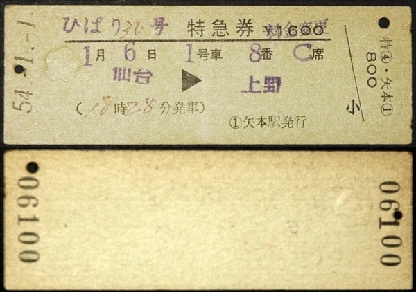 563☆☆硬券・ひばり30号・特急券・仙台→上野・S54・矢本駅発行☆