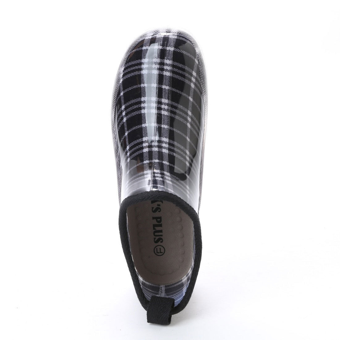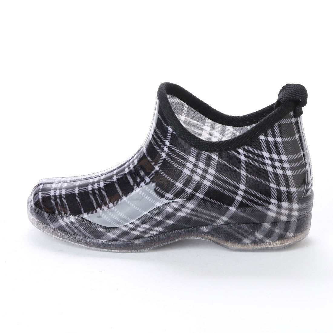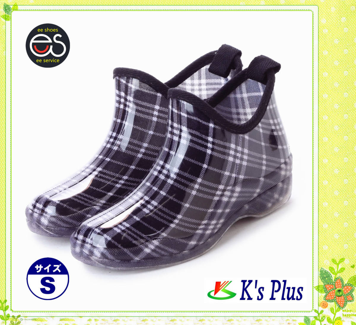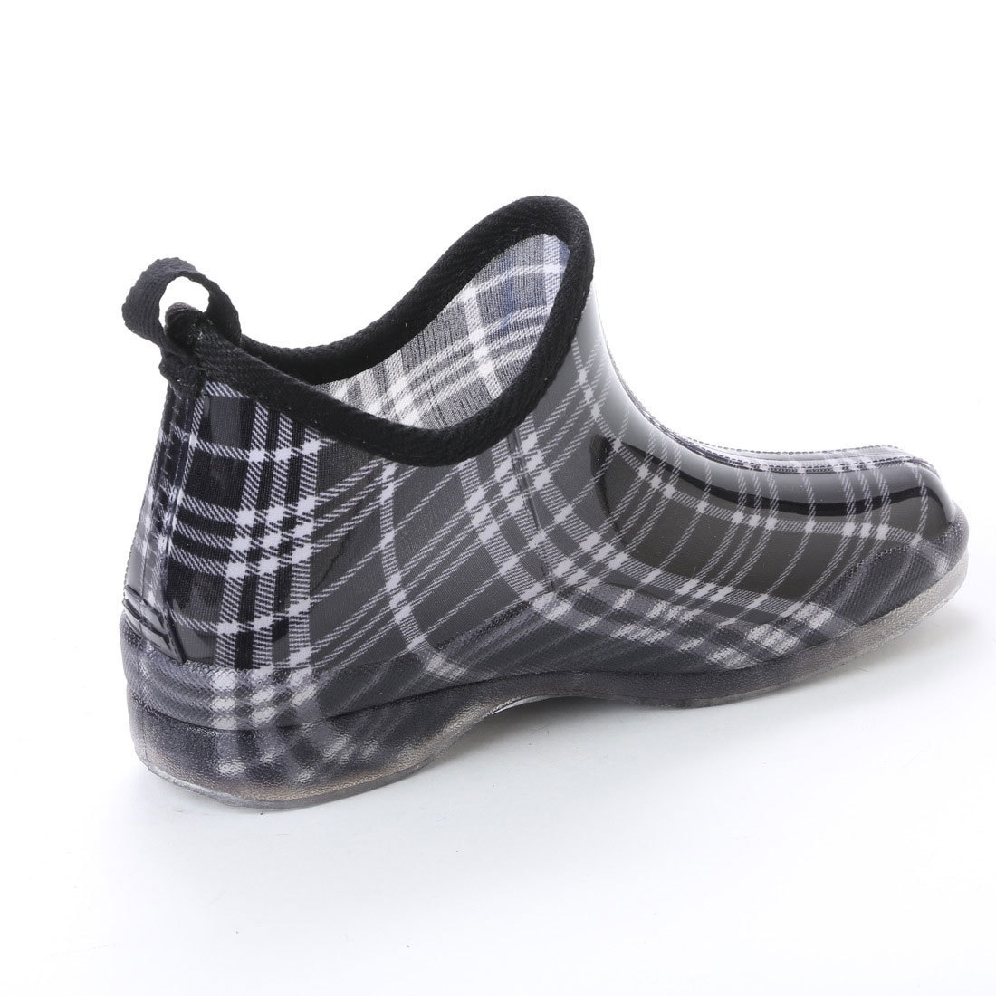 婦人ショートレインブーツ、人気のブラックチェック柄、ガーデニングや掃除や外出にもシーンを選ばず使い勝手がよい。人気の定番商品!