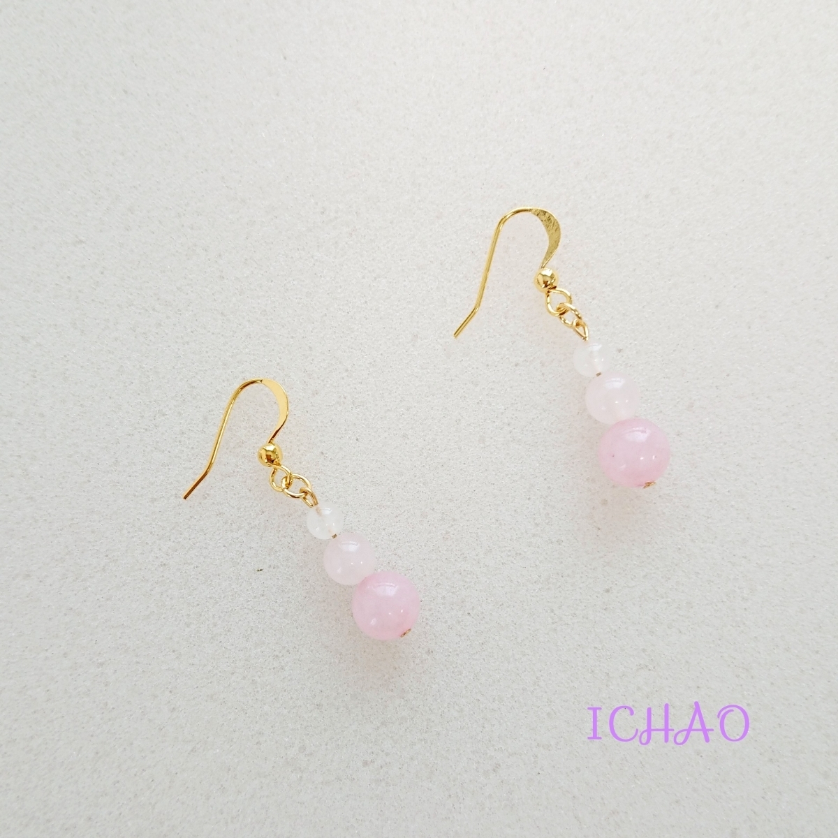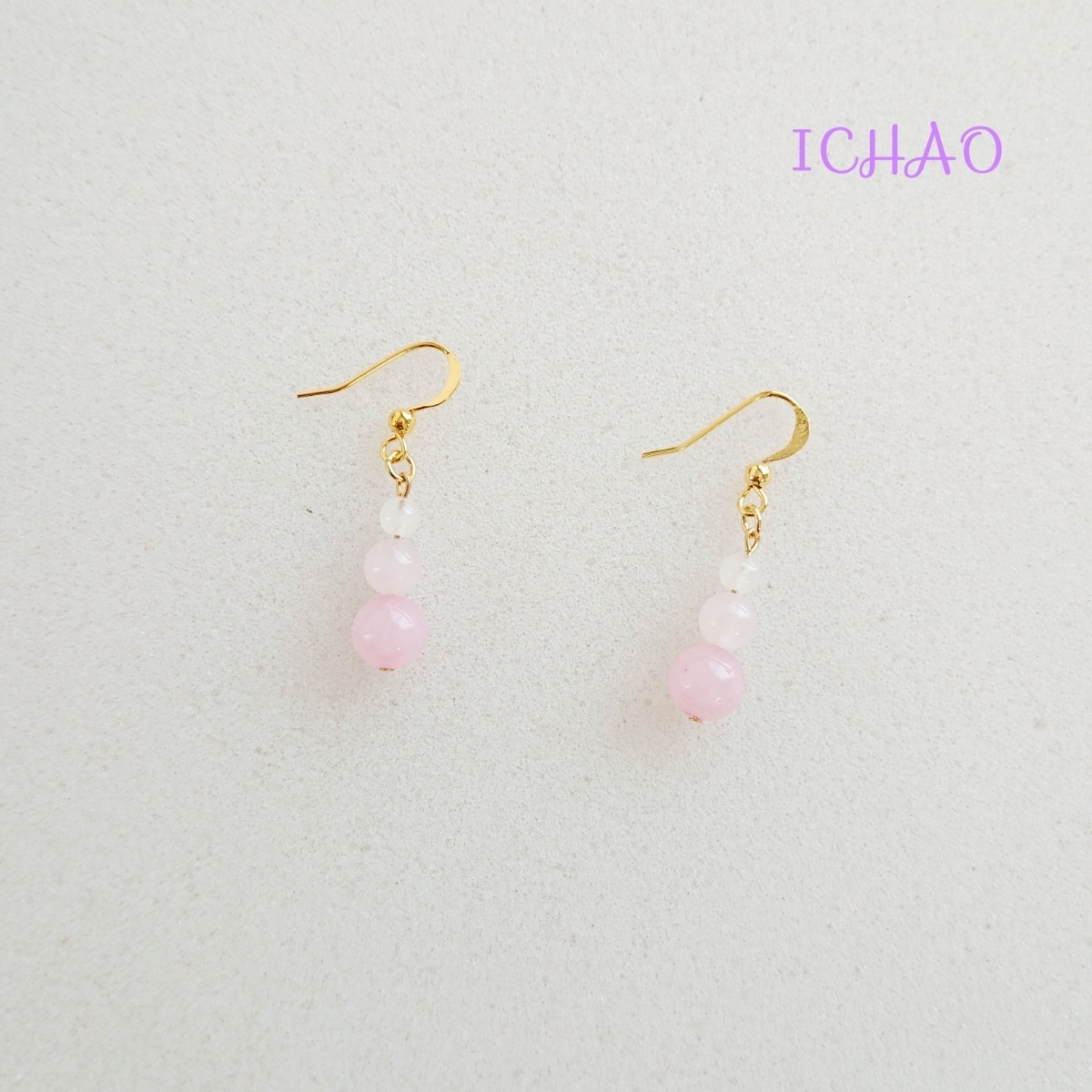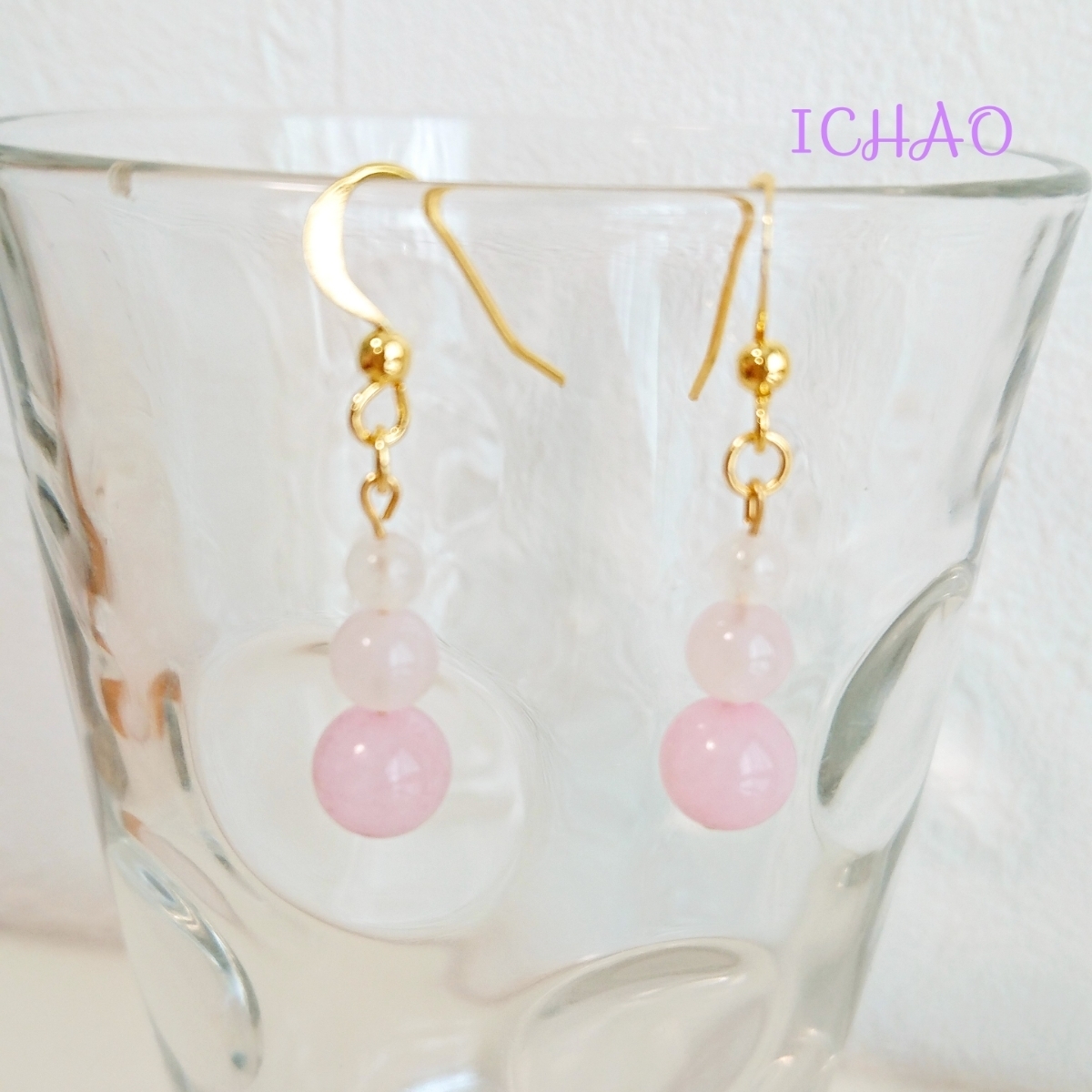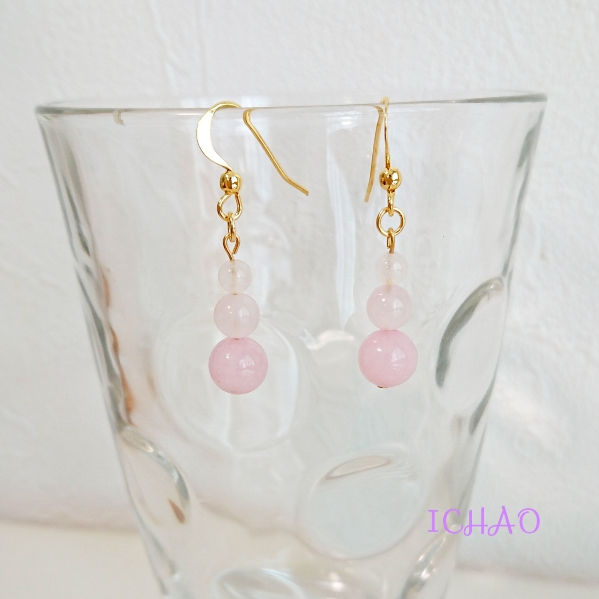 天然石ローズクォーツの8,6,4㎜の丸玉を3連にしたピアスです。