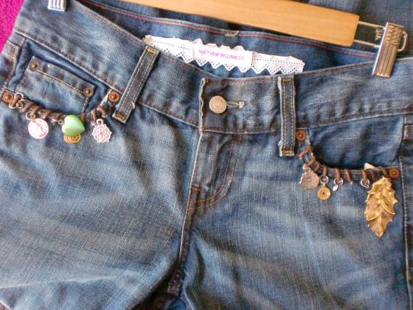 ポケットの淵に、コイン、ハート、葉っぱ、角、ビジュー等のチャームがぶら下がっています。