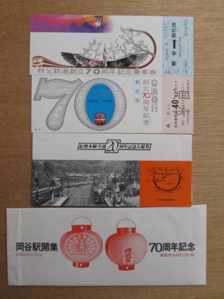昭和43年から同54年に発行された、国鉄 私鉄 岡谷駅開業70周年 記念券など 4種 8枚 袋入りです。 ① 昭和43年6月1日に発行された、京浜急行 創立70周年 記念乗車券です。右側の本券部分に、点字で「見本」と打たれています。裏面は白紙。 ② 昭和44年10月1日に発行された、秩父鉄道 創立70周年 記念乗車券です。熊谷駅 から 御花畑駅 ゆきの140円券が付いています。裏面は白紙。 ③ 昭和50年11月25日に発行された、岡谷駅 開業70周年 記念券 4枚袋入りです。中央本線 岡谷駅発行。開業当時の駅舎・古い時刻表・懐中時計・合図灯・蒸気機関車のモノクロ写真がデザインされています。裏面は白紙。袋の裏側に記念スタンプが捺されています。 ④ 昭和54年7月15日に発行された、紀勢本線 全通20周年 記念入場券 2枚袋入りです。新旧車両の写真がデザインされています。裏面に説明文。 サイズは①がタテ6.2cm×ヨコ17.4cm、②が6.6cm×17.6cm、③の袋が8.4cm×21.5cm、④の袋が7.8cm×17.1cm。 ①は美品です。②の裏面の一部に極小シミがありますが、美品です。③の袋の左端に折れ(送付用封筒のサイズの関係で折ったもの)・記念券に1か所ずつ小折れシワがありますが、保存状態は良好です。④は美品です。 定形外郵便180円でお送りします。 ★保存状態の記述は、あくまで出品者の主観的な評価ですので、保存状態にきびしい方は、入札をご遠慮願います。