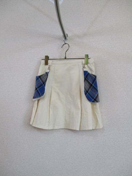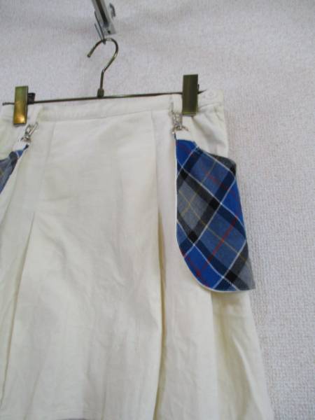 商品紹介 | クリームがかった白のプリーツスカートです。 取り外しのできる青を基調としたチェックのポケットがポイントになっています。 (ポケットはベルト通しに金具で引っ掛ける形になっています。) スカート本体とチェックのポケットの裏地にはベロア素材が使われています。 《素材》 綿100% |