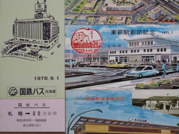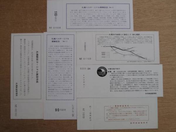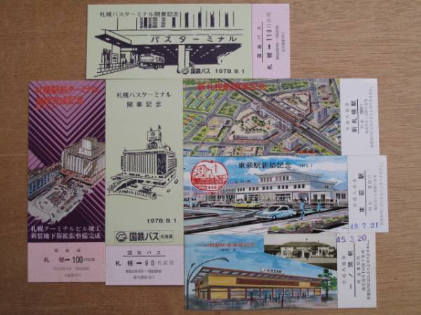 昭和45年から同53年に発行された、国鉄 駅舎新築 記念入場券 記念乗車券 5種6枚 です。 ① 昭和45年3月20日に発行された、一ノ関新駅舎落成 記念入場券 です。盛岡鉄道管理局発行。新旧駅舎の写真とイラストが使われています。裏面に説明文。 ② 昭和7年7月21日に発行された、東萩駅新築 記念入場券 です。米子鉄道管理局発行。新駅舎の鳥瞰図が描かれています。裏面に説明文。 ③ 昭和48年9月9日に発行された、新札幌駅開業 記念入場券 です。北海道総局発行。昔の直江津駅の鳥瞰図が使われています。裏面に年表。 ④ 昭和53年9月1日に発行された、札幌駅前ターミナル施設完成 記念乗車券 です。札幌鉄道管理局発行。「 札幌ターミナルビル竣工 新装地下街拡張整備完成 」という副題が付いています。新施設の鳥瞰図が描かれています。裏面に説明文。 ⑤ 昭和53年9月1日に発行された、札幌バスターミナル開業 記念乗車券 2枚です。国鉄バス 北海道 発行。新施設のイラストが描かれています。裏面に説明文。 サイズは①がタテ5.8cm×ヨコ14.8cm、②が6.0cm×15.8cm、③が6.1cm×15.3cm、④が15.7cm×6.0cm、⑤が16.0cm×6.1cm。 ④の一部に薄い小シミがありますが、保存状態は良好です。他はいずれも美品です。 定形郵便110円でお送りします。 ★保存状態の記述は、あくまで出品者の主観的な評価ですので、保存状態にきびしい方は、入札をご遠慮願います。