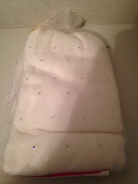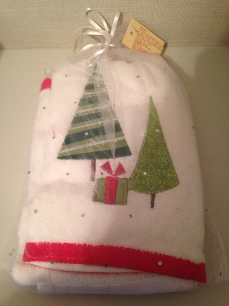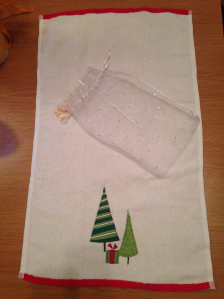 モミの木2本とプレゼント箱モチーフに赤のラインが入った可愛らしい、新品未使用タオルです。