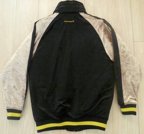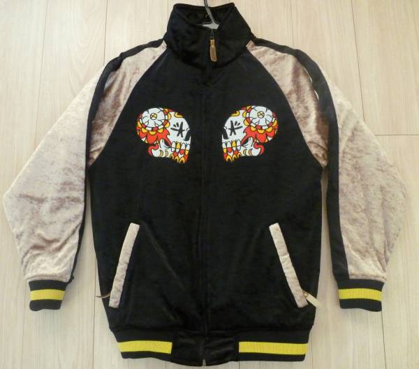 大変デザイン性の高いスカジャンになり、光沢のあるゴールドと黒のベロアをベースにフロントはメキシコスカル風なデザインが刺しゅうされており、各ジップ部はレザーが付きます。