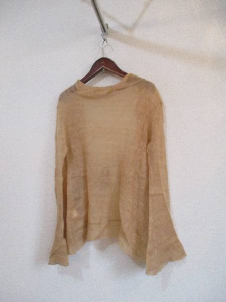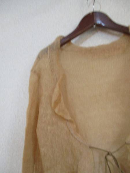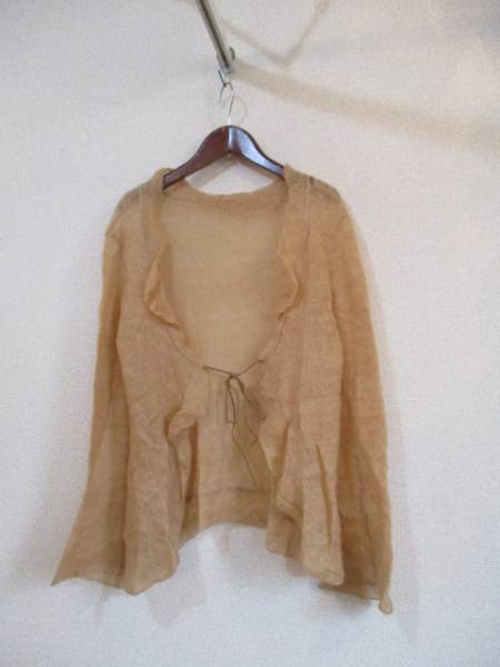 商品紹介 | 端のフリルがオシャレなカーディガンです。 フロントは合皮のような紐を結ぶ形です。 袖は袖口に向かってAラインに軽く広がっています。 色はベージュで、透け感があります。 【素材】 ウール50% 毛-ヘア40%(おそらくモヘヤ) ナイロン10% |